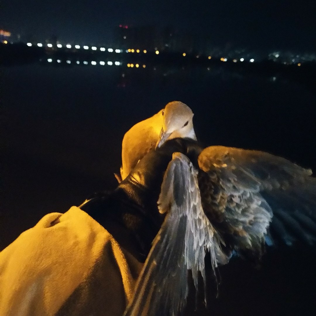 ……半个小时来到了河边桥上,四只放了六次😀️😀️其中有两只放出去又回来了,真的有灵性嘛不舍得我嘛😄,水面太黑没有拍到它们游走🏊🏻的画面。(三只飞到水里,一只飞去树上了)