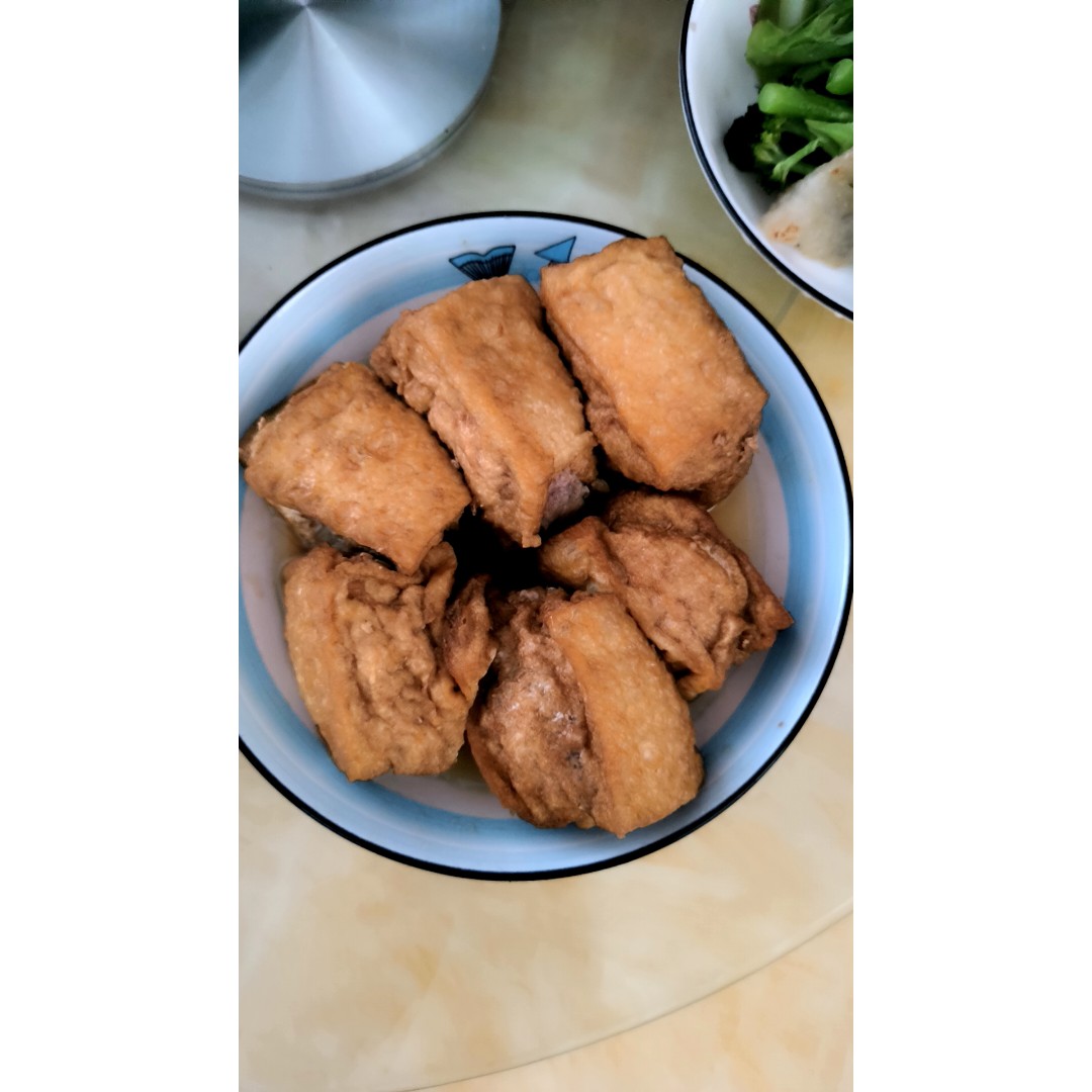 怎么说呢?它不是油豆腐泡,是那种白色的水豆腐炸过的,表面是油皮,但是里面又是跟水豆腐一样是实心的,比那些豆腐泡酿起来更好吃点