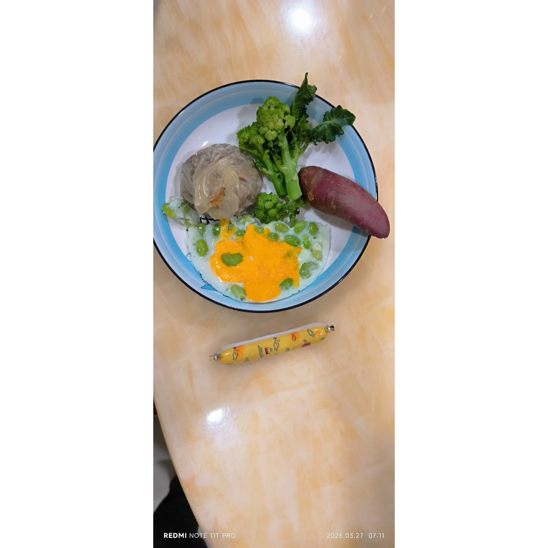 这是大娃的早餐。跟平时的原材料都是一样的,但是把青豆跟鸡蛋一起叮的话,就感觉像豆抱蛋。大娃非常惊喜,问这是不是新品。其实不知道味道怎样,但是卖相是非常不错的。今天加了番薯,外加一条鳕鱼肠,基本的营养是覆盖到了,能不能吸收的全面就看她自己了,老母亲已经尽到最大的努力!