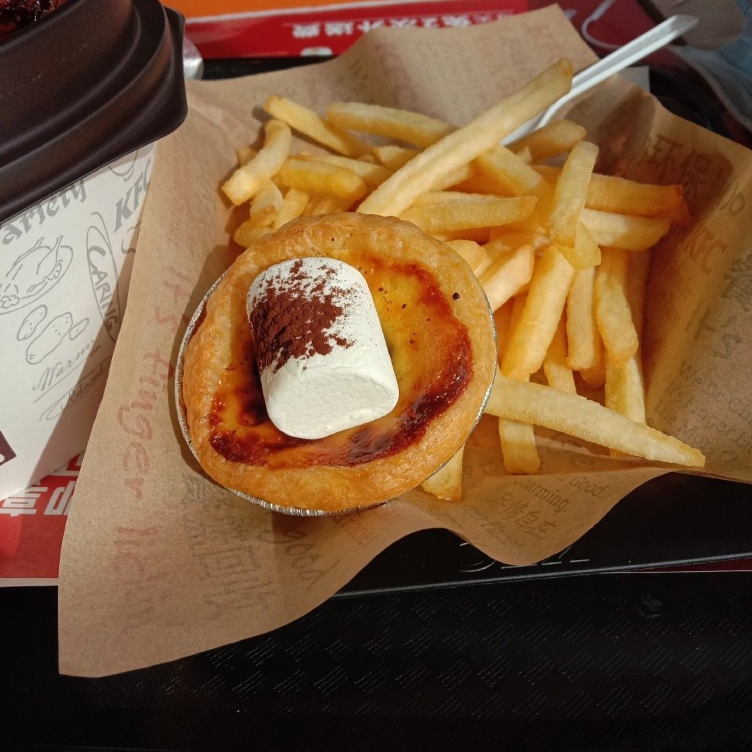 最近KFC新出的云朵蛋挞,巧克力夹心的葡挞上边放了一颗撒了巧克力粉的棉花糖