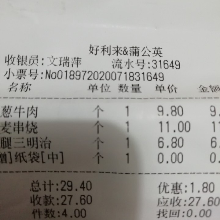 会员卡有优惠1.8元,最后总计消费¥27.6 $4