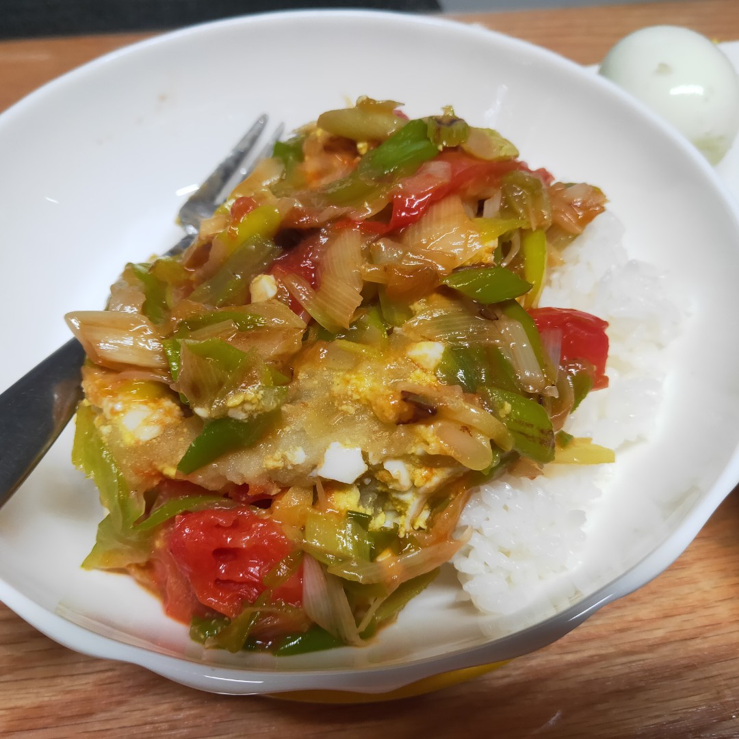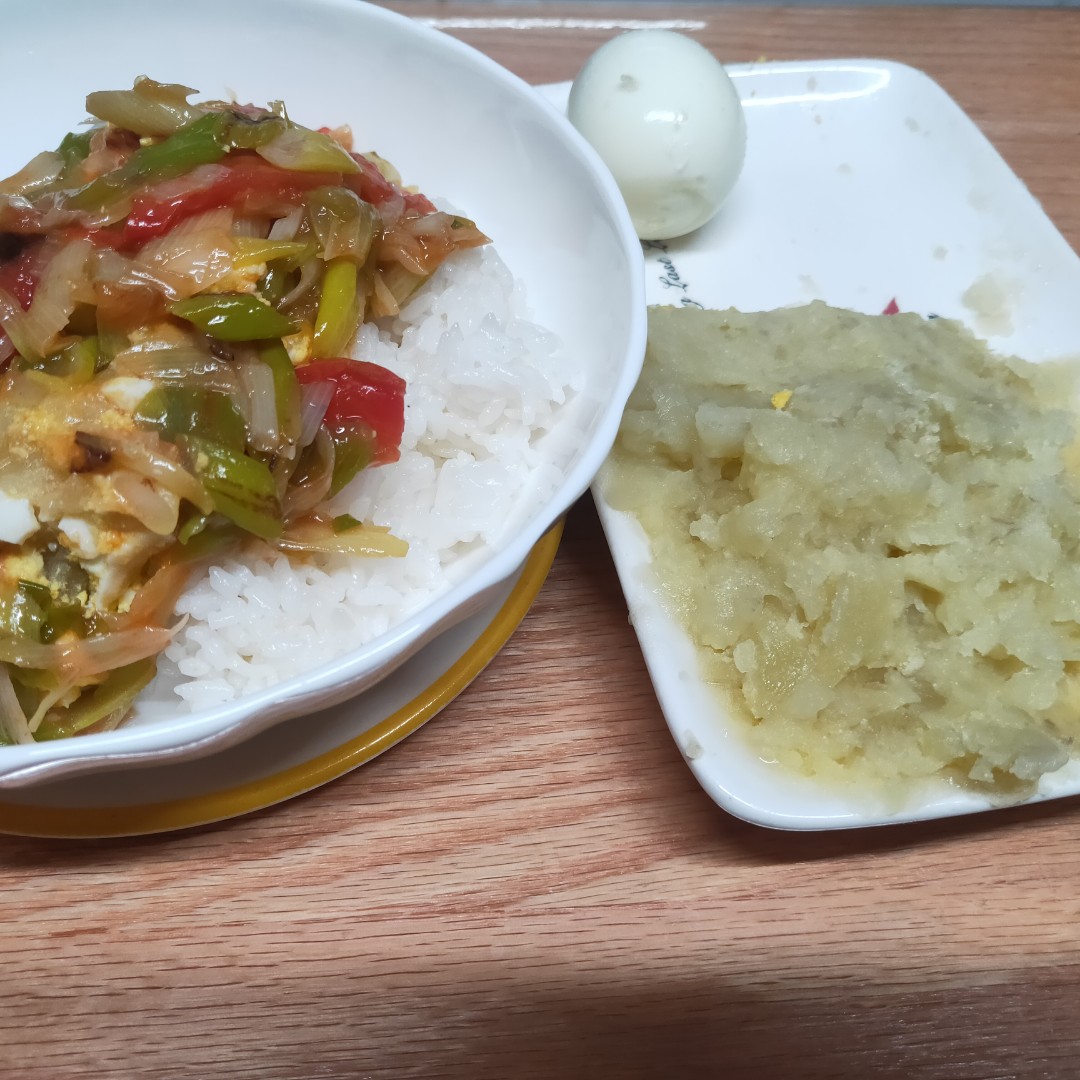 昨晚剩了米饭,早上给小姑娘做了一个盖饭。大葱炒西红柿,煮鸡蛋压碎拌在土豆泥里,和在一起,盖在米饭上。
