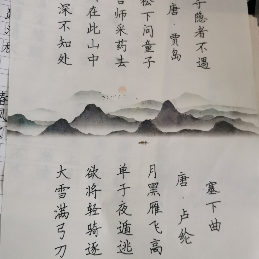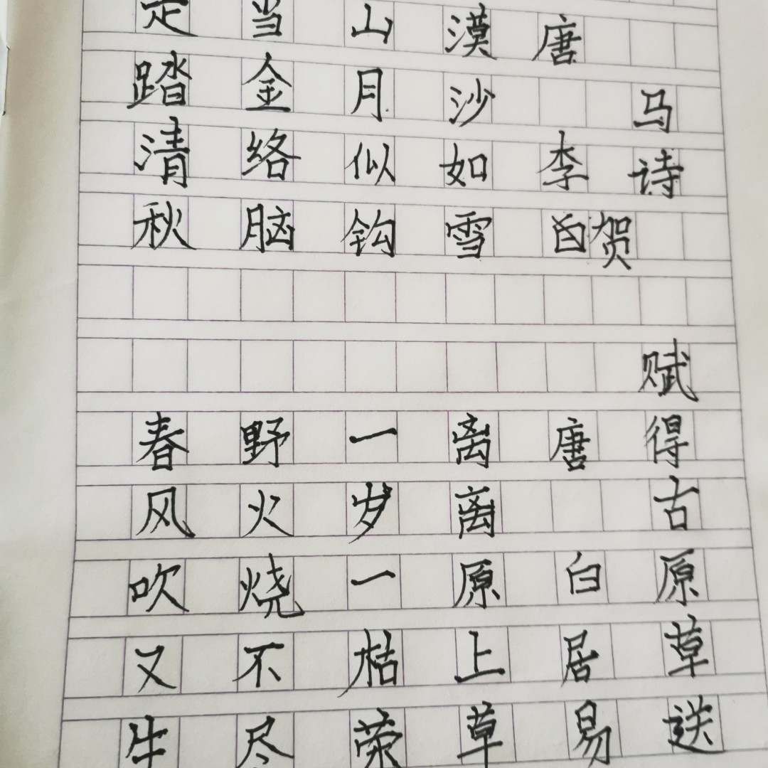没办法,只好硬着头皮上了。发现有点生疏,手僵硬了,眼模糊了。第一张图是临摹的,第二张图是自己用本子写的。第三张图是妞临摹的,第四张图是女儿写的。女儿九月份就要上三年级了,希望她们持之以恒,把字体练好,学习上有自律!