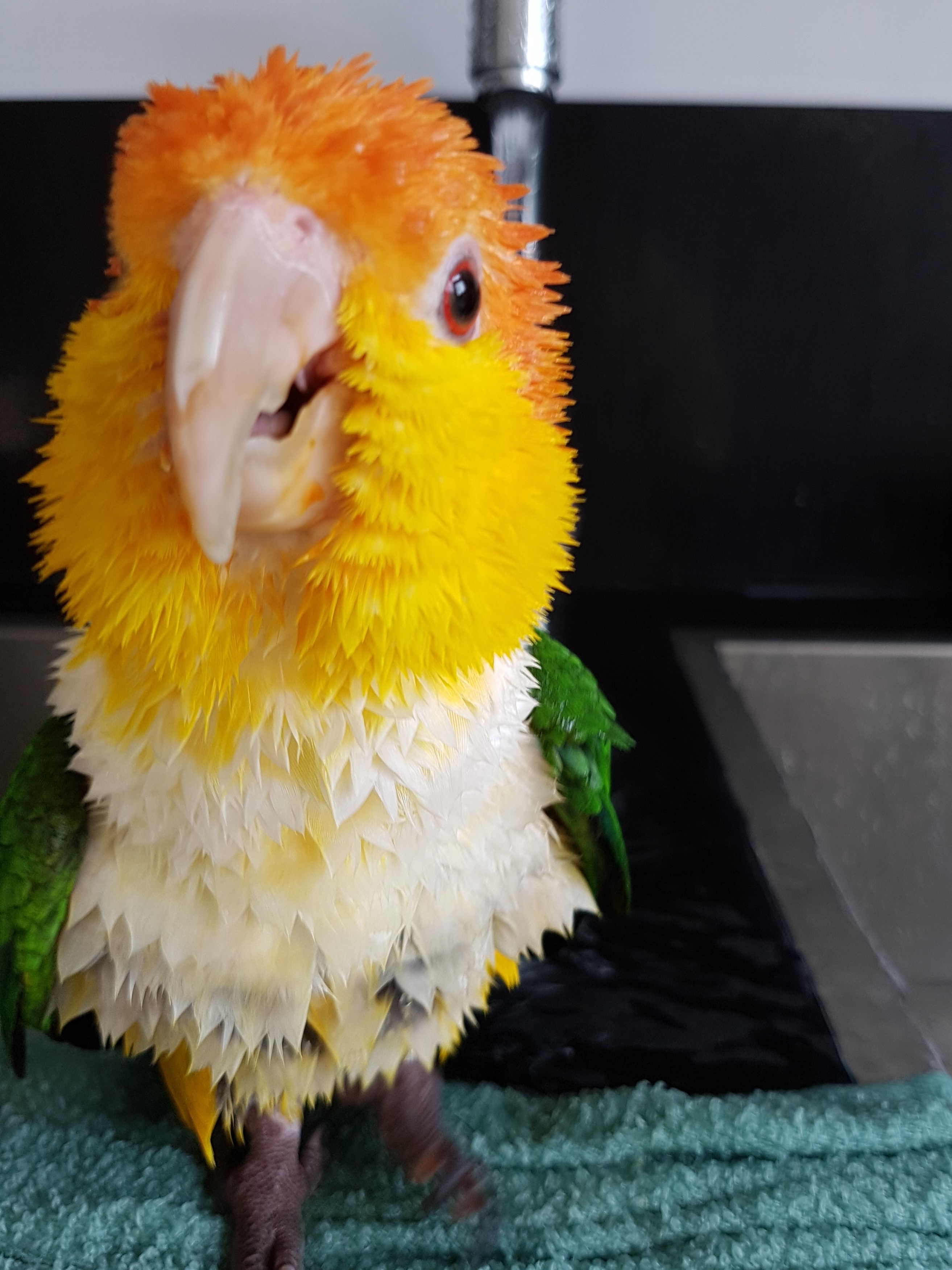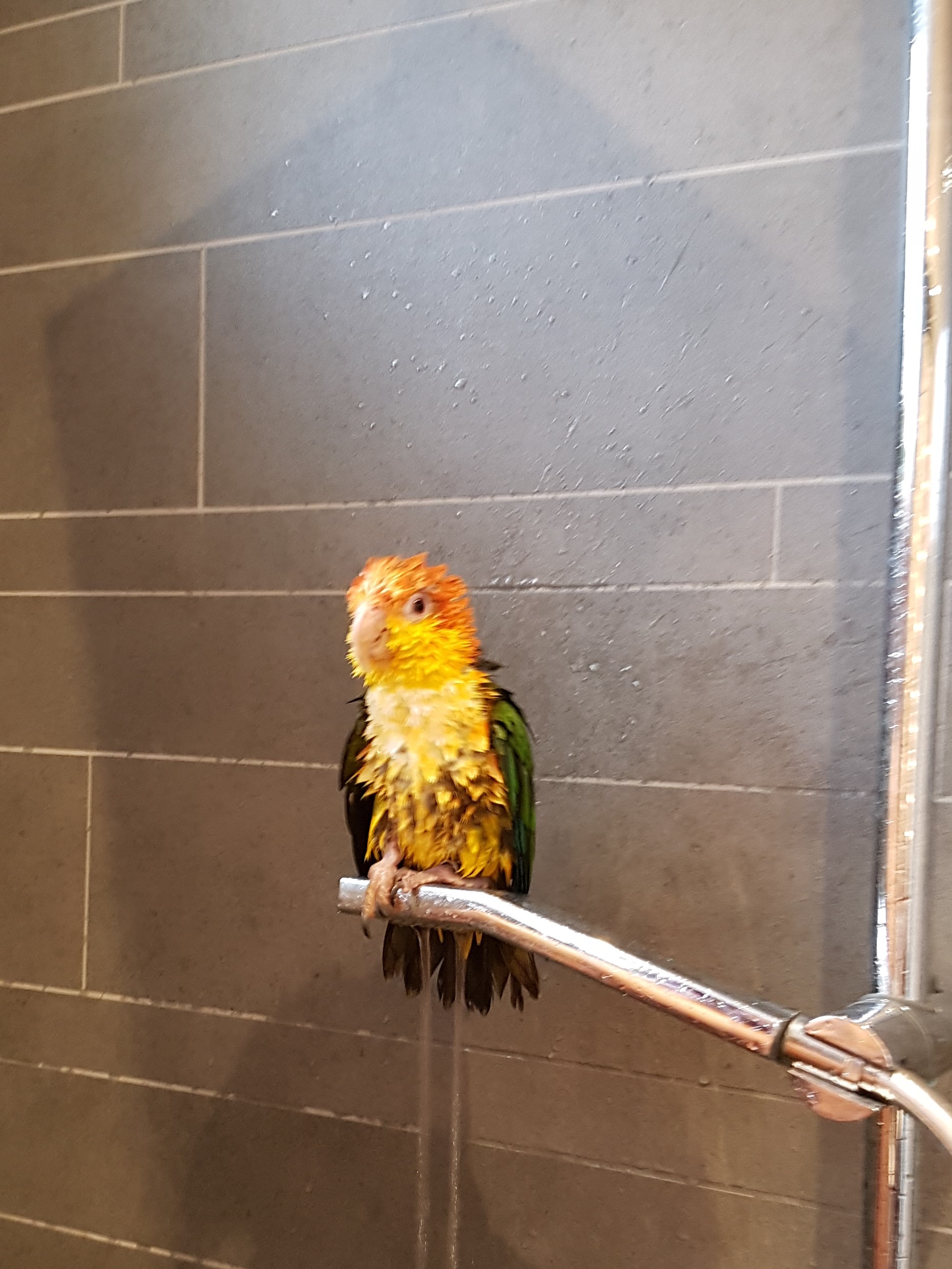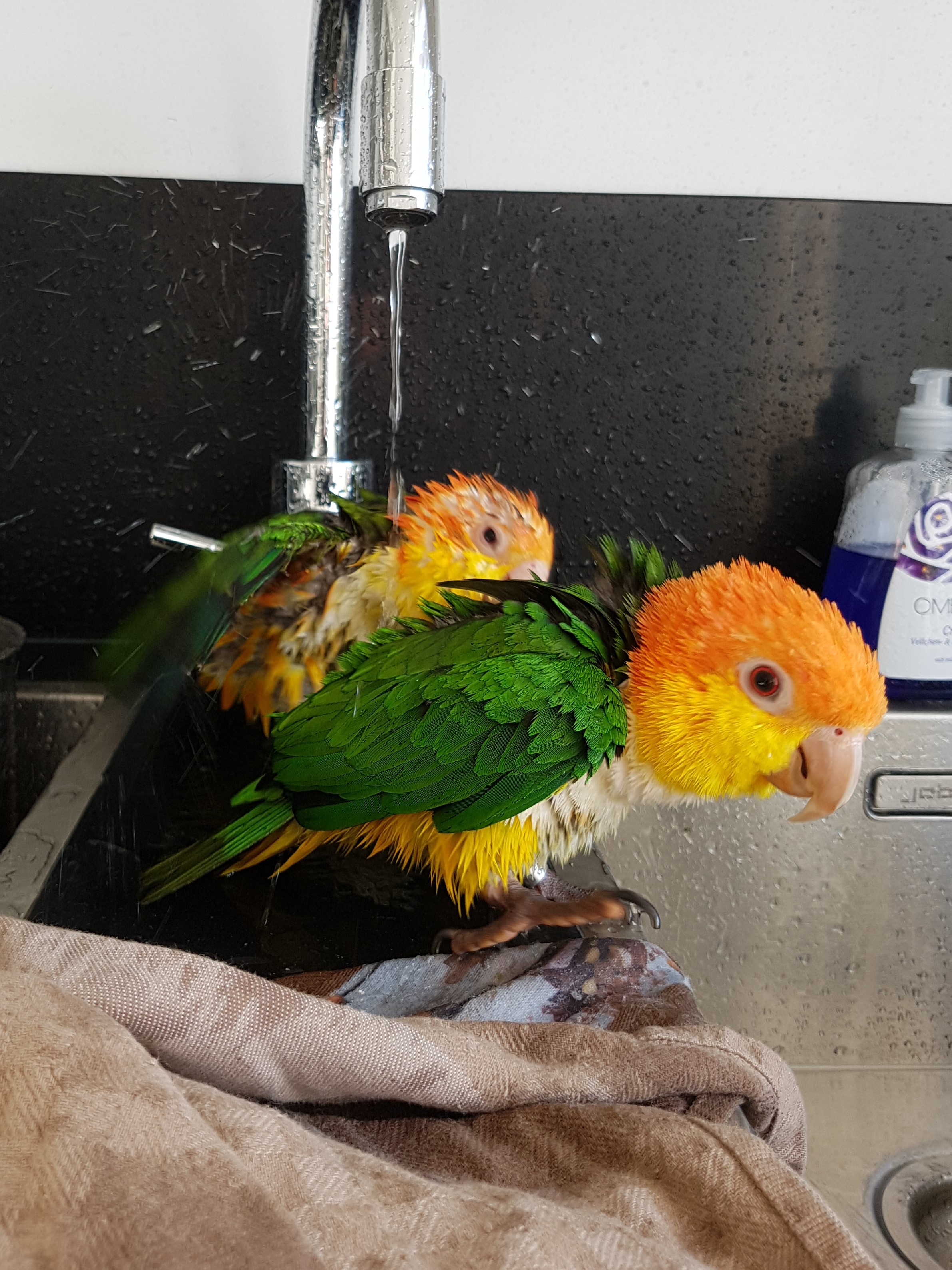 Shower timecaiquelilodori (25)in #whitebelliedcaigue • 8 years ago Somethimes Lilo and Dori take a shower in the kitchen or bathroom. And they like it! We hope you like our stories #bird #birdlover #lilo #dori