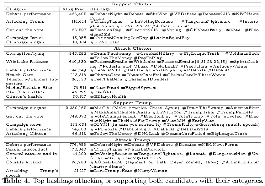 - The most frequently appearing hashtags on the Trump side were those iterating his campaign slogans, encouraging people to vote, and spreading campaign news.