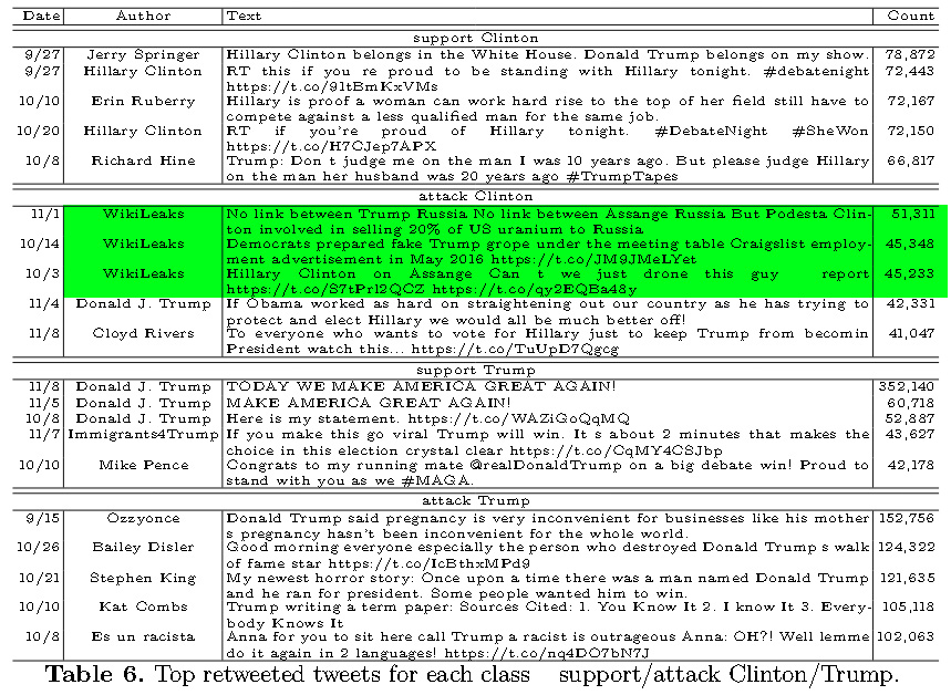 - Most retweeted accounts for “support” and “attack” classes were those of the candidates themselves and their rivals respectively.