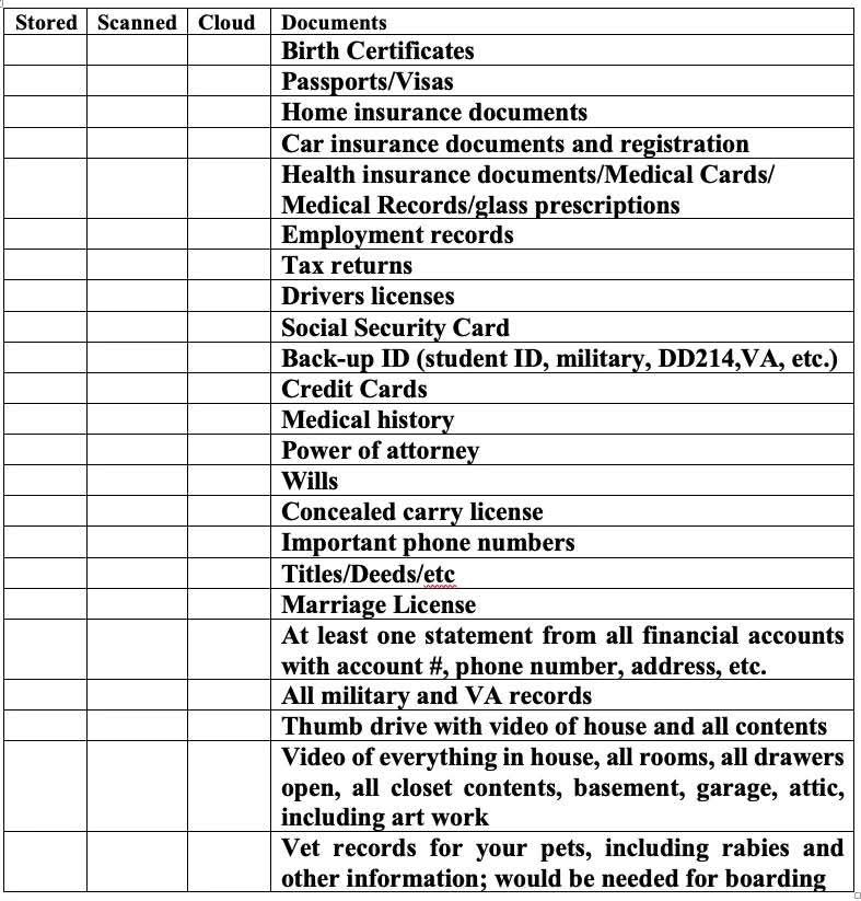 Most of the list is easily recoverable and isn't urgently needed anyway. Medical living will, medical proxy are probably important if you have them (this is a scenario where people may be under emergency care, sadly) and maybe aren't clearly included under "documents" and "power of attorney".