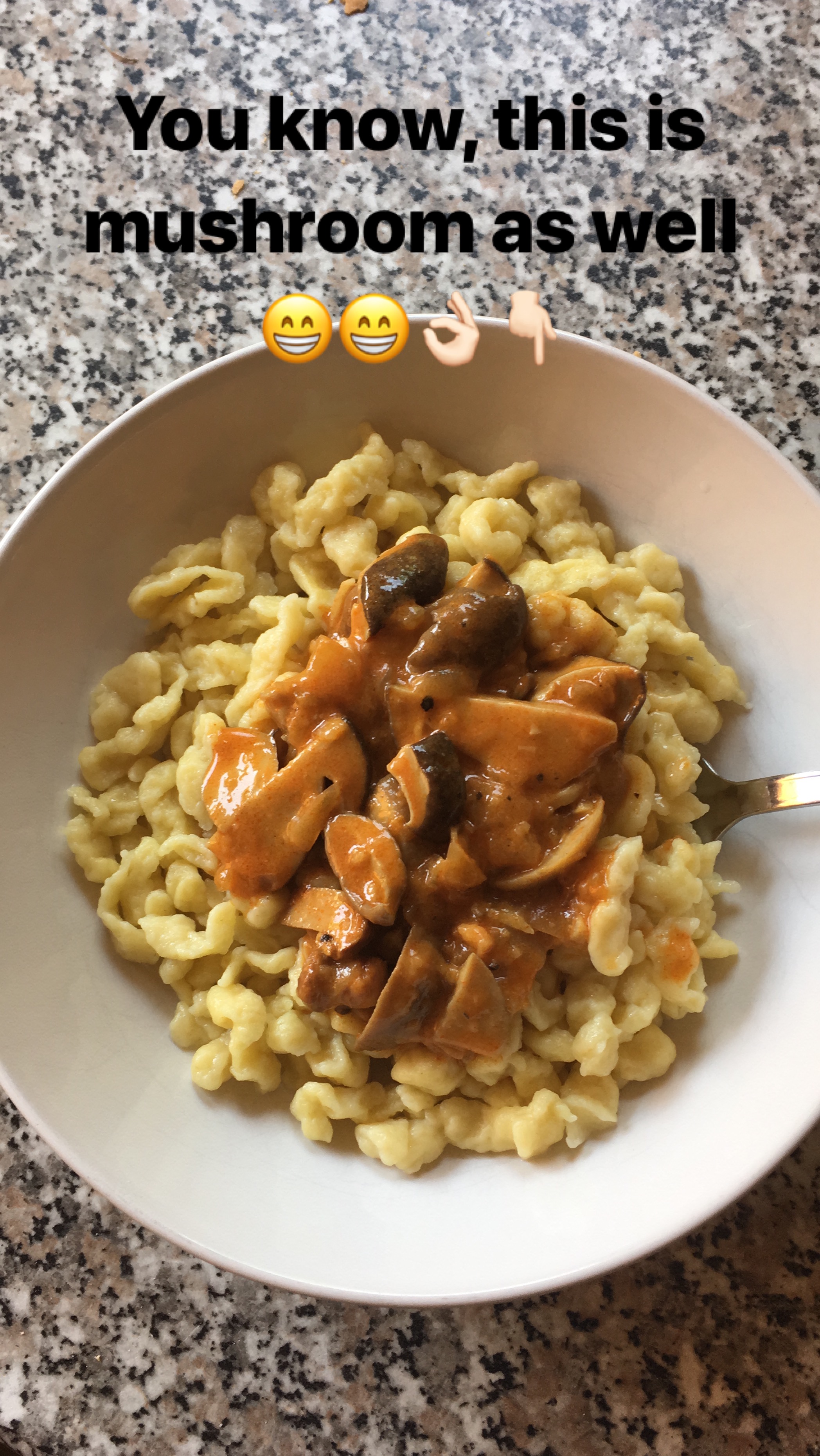 As in the region people used to eat it with noodles which is like flour few eggs, some water and salt mixed together pressed trough some kind of plate with small holes into hot water.