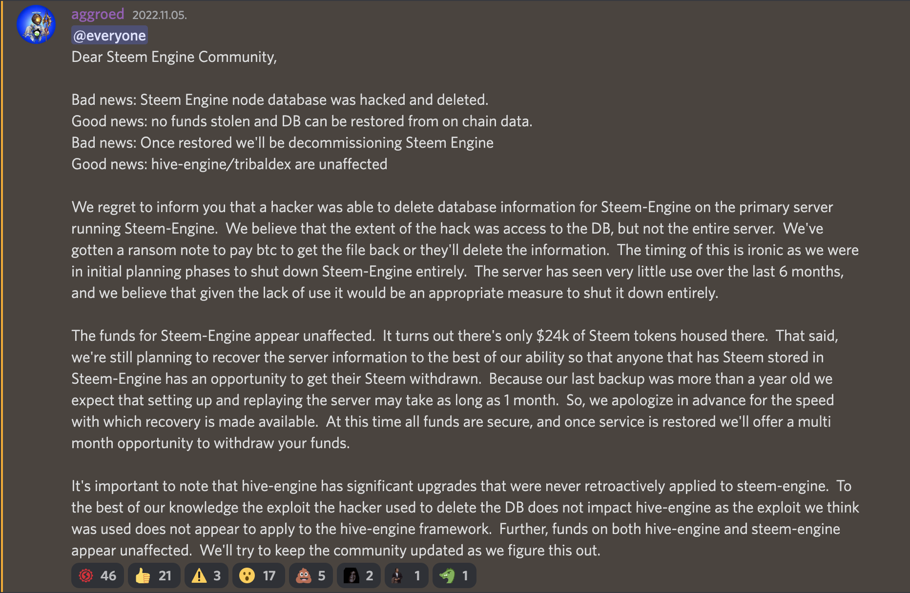Announcement regarding the Steem Engine hacking issue
