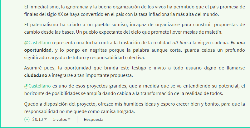 Me gusta la propuesta que está haciendo el witness castellano, y espero el crecimiento y alcance que tiene a las personas seas cada vez mayor. Hagamos de steemit un lugar de crecimiento y no una rápida solución para problemas cotidianos. Espero esto logre crecer, y se promueva mucho más la meritocracia y no... bueno, el resto de las cosas que nos han vuelto una sociedad vacía y conformista (y además creyente de que merecemos el cielo barriendo el polvo).
