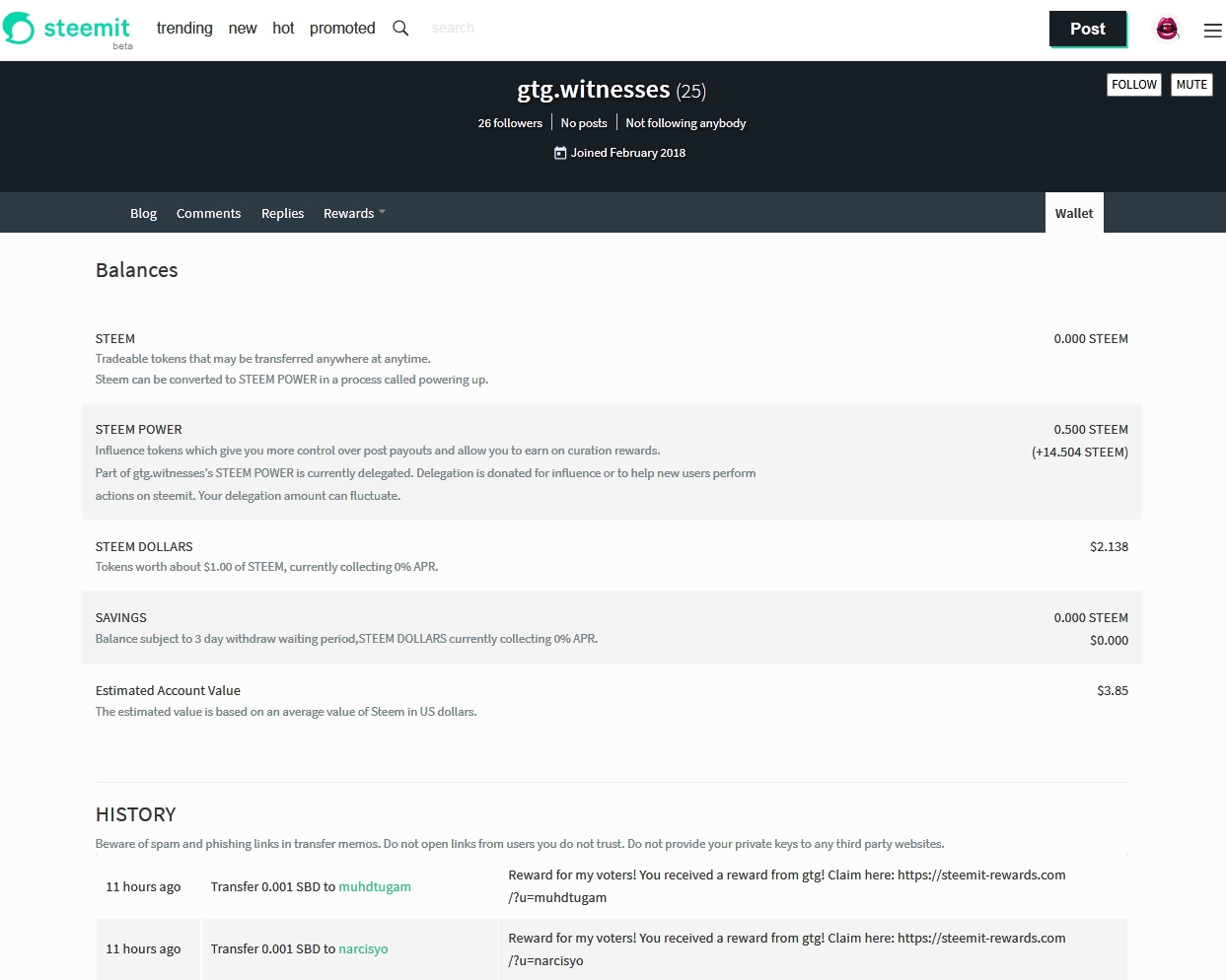 Then I checked the profile of @gtg.witnesses and that account was barely created this month and there where a bunch of people who got the same message I did, as you can see from the screenshots I took from his profile.