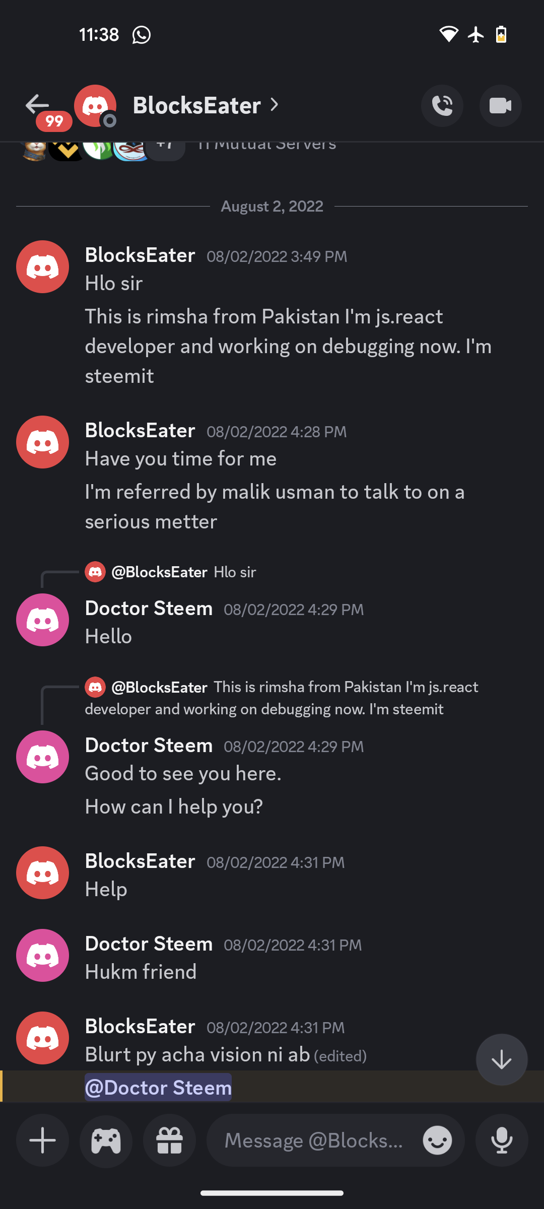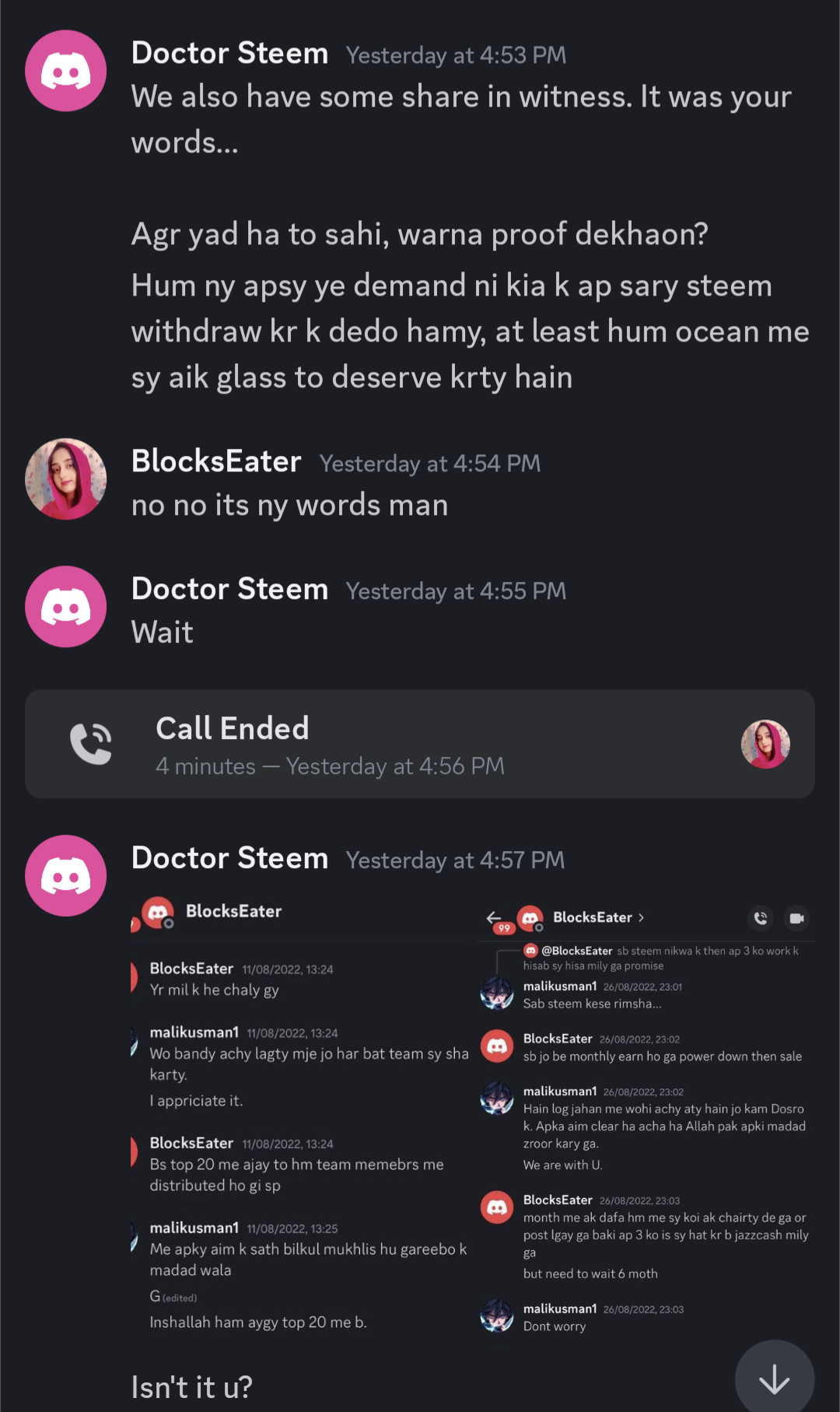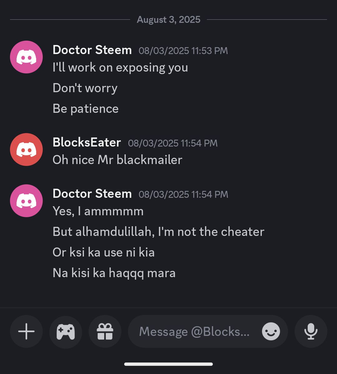 On the 3rd of August 2025 (3 days back), when we asked her about the progress of the witness then she showed some strange behavior. She treated us like we are not her team members, like we are forcing her to give us the funds. But we just reminded her about her promises that she made at the start of the journey.