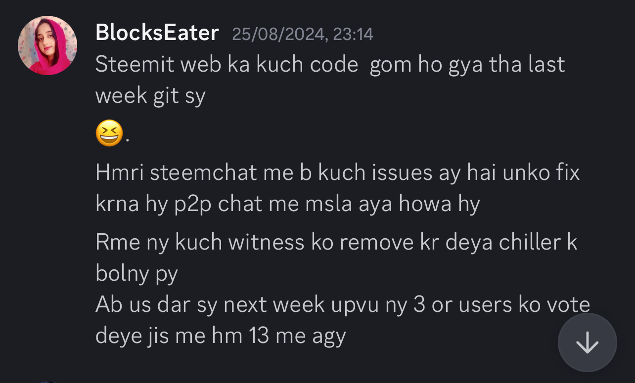 She asked us that we will work as a team and run a witness node from Pakistan. We will work for the betterment of our people, we will do charity, we will help the common users from Pakistan with our votes and delegations, bla bla bla....