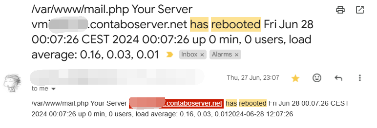 I've added a crontab reboot event, so that I get any the email notification when the server reboots.