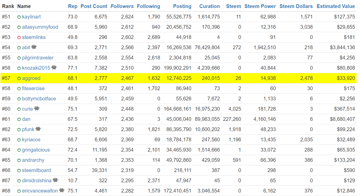 You can see me growing on Steemwhales.com. I like tracking by follower count more than any other metric. You can see I'm ranked the 57th most followed steemian on the site. It's getting hard to go up too. Not only do I have to gain more followers, but I have to out pace some amazing authors. It's tricky. That said there's some legends in the list that I just passed. I'm really honored to have this much support.