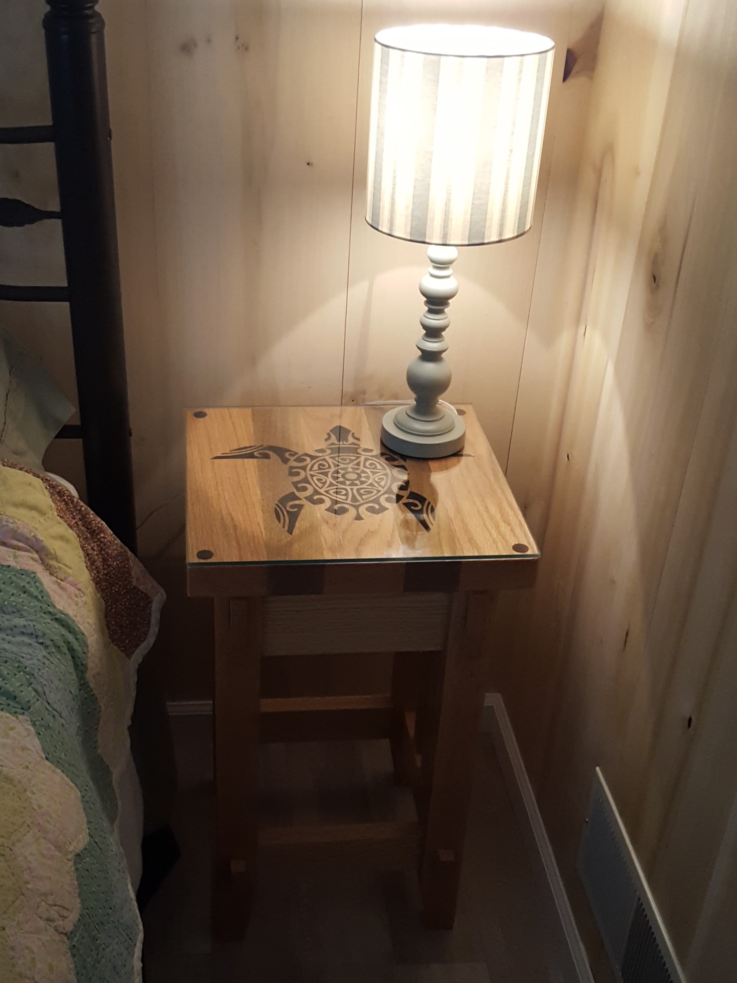 Turtle Night Standscrutchwoodworks (29)in #woodworking • 8 years ago Got the guest room finished with these two turtle night stands. I put in the shiplap after I dried and planed it from green poplar. I made these two tables to fit the space left on the side of the double bed. #tables #oak #engraving #nightstands