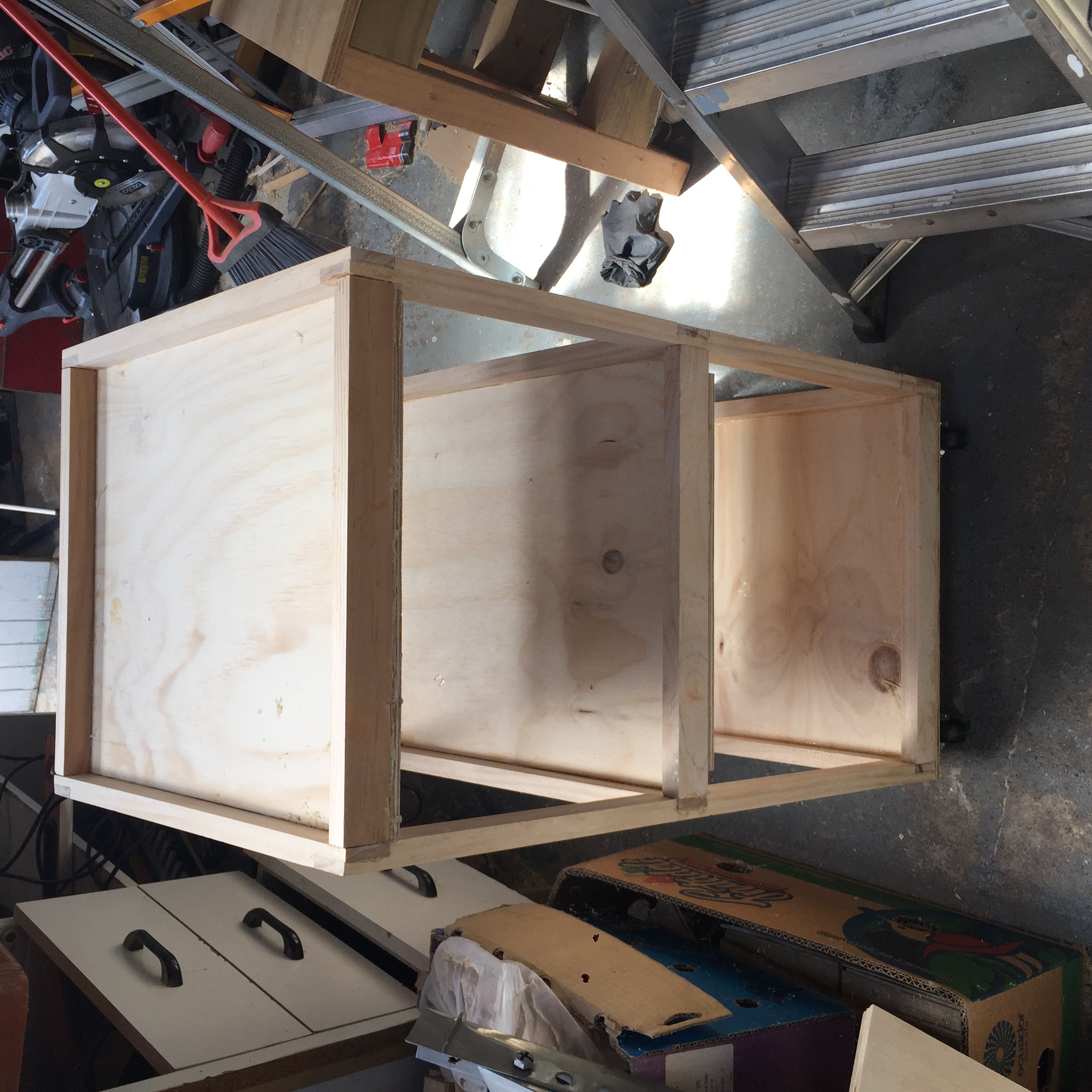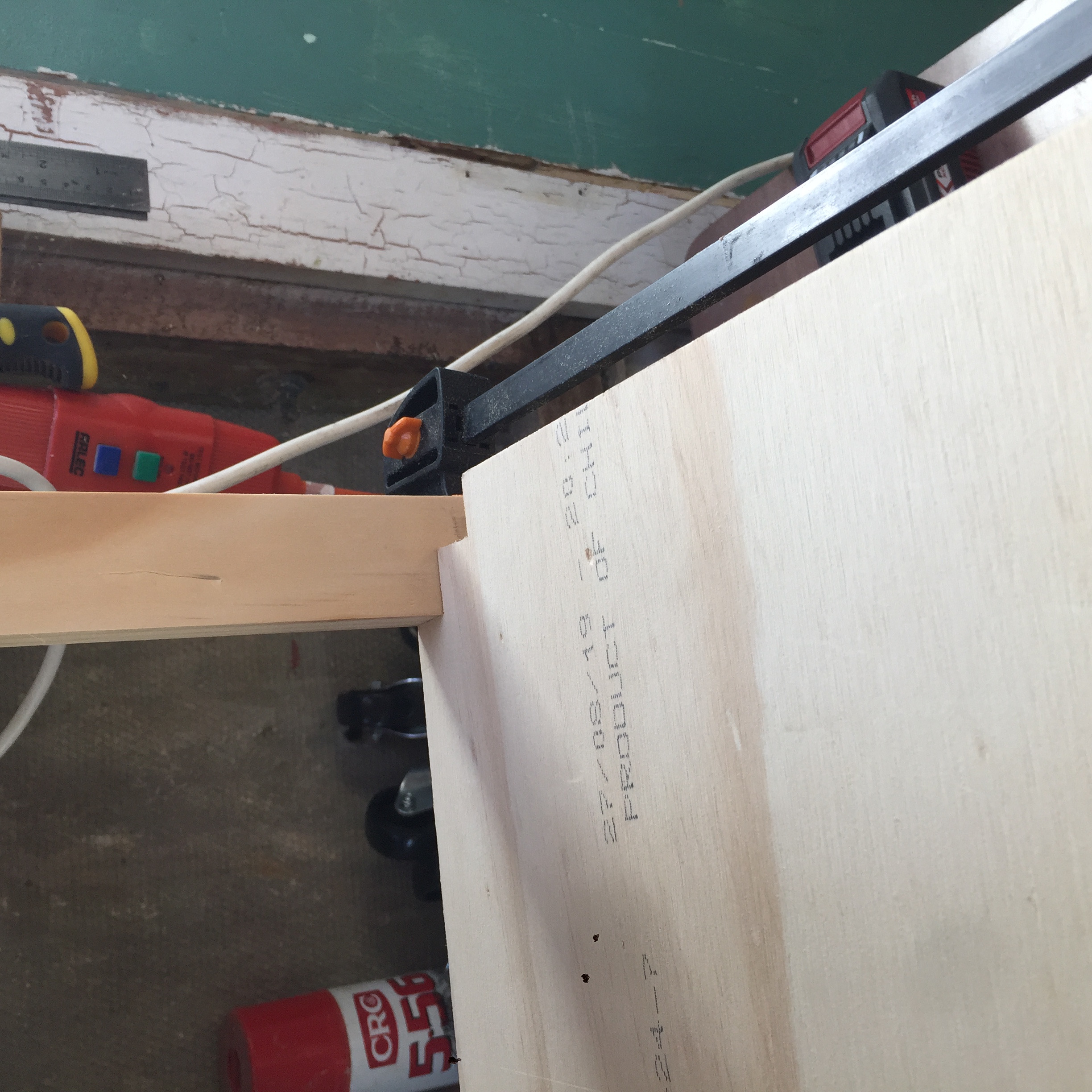 During the course of cutting the shelves I realised that I had cut everything to the wrong dimensions. This wasn't too much of an issue because I only needed to trim them down (if you're going to screw up make sure it's not by cutting too short). It's only after trimming that I realised I'd cut one with the grain in the wrong direction. No worries, this just ended up as the bottom shelf.