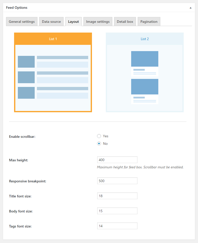 Enable scrollbar: Displays a vertical scrollbar that allows you to scroll down the feed. Works in conjuction with the 'Max-height' parameter.
