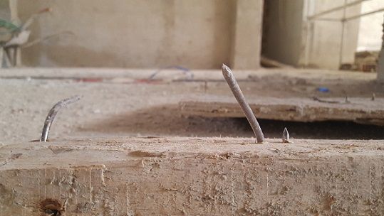 Yerde alenen ortalığa saçılmış tahta parçalarında bulunan çiviler iş kazası yönünden büyük tehdit oluşturmakta. Bu durum da neredeyse tüm inşaatlarda karşımıza çıkan ihmallerden biri.