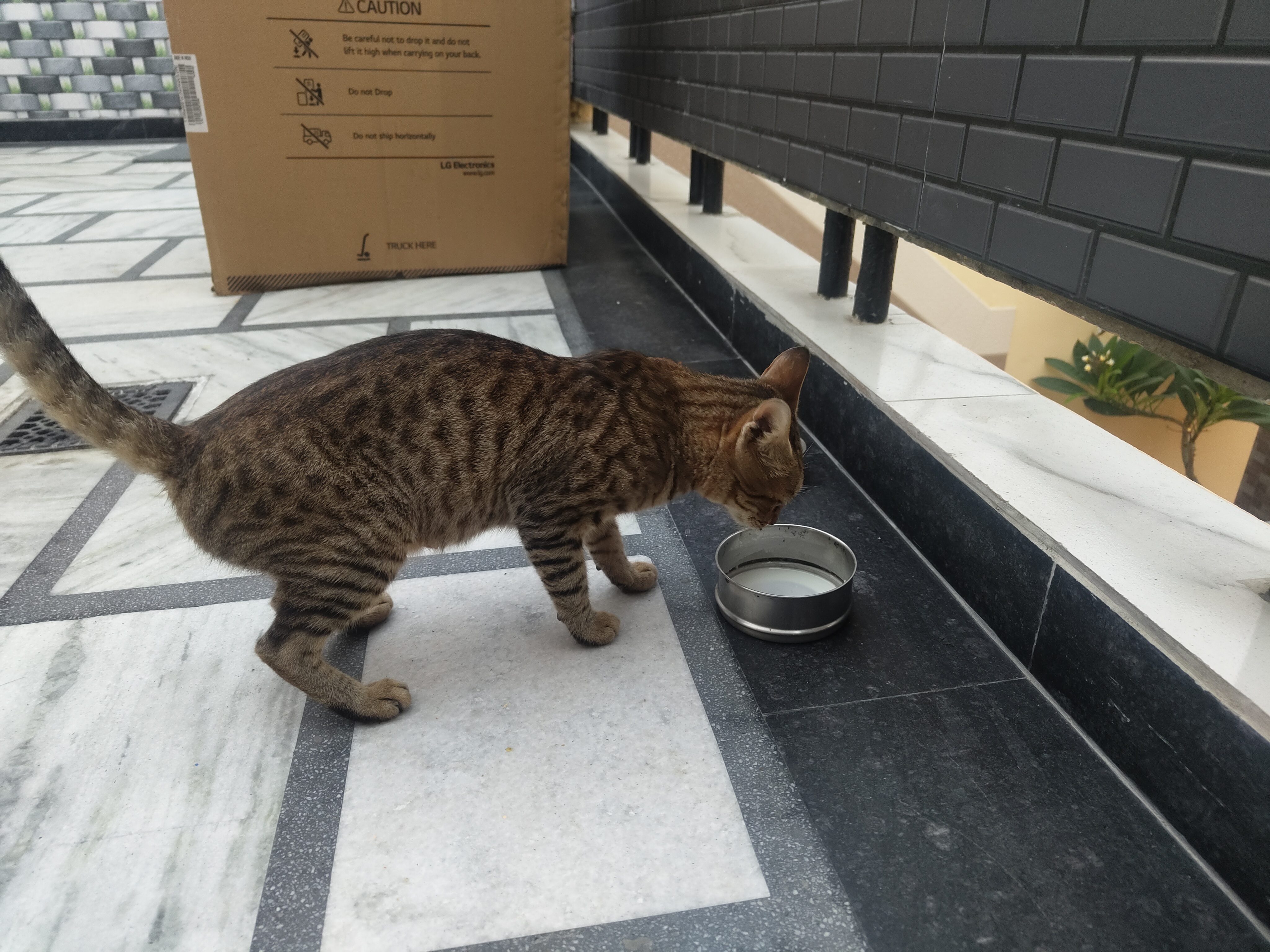 At 7:30 she walked in the door and said it was time for milk. Then I took a bowl for her and went to the kitchen and put the milk on the gas. The milk started heating up.I have not heated the milk too much because she cannot drink it, so I have heated it a little lightly, then I have also added some sugar to it, which will make the milk a little sweet, she will like it Then I put a bowl of milk in front of her and she starts drinking. I think she was very hungry so she has to drink the milk very quickly.She takes 5 to 10 minutes to drink milk and then she goes away after a while and I pick up her bowl and take it to the kitchen and clean it. I think that you will come the next morning so I will have to keep the bowl clean from now onwards