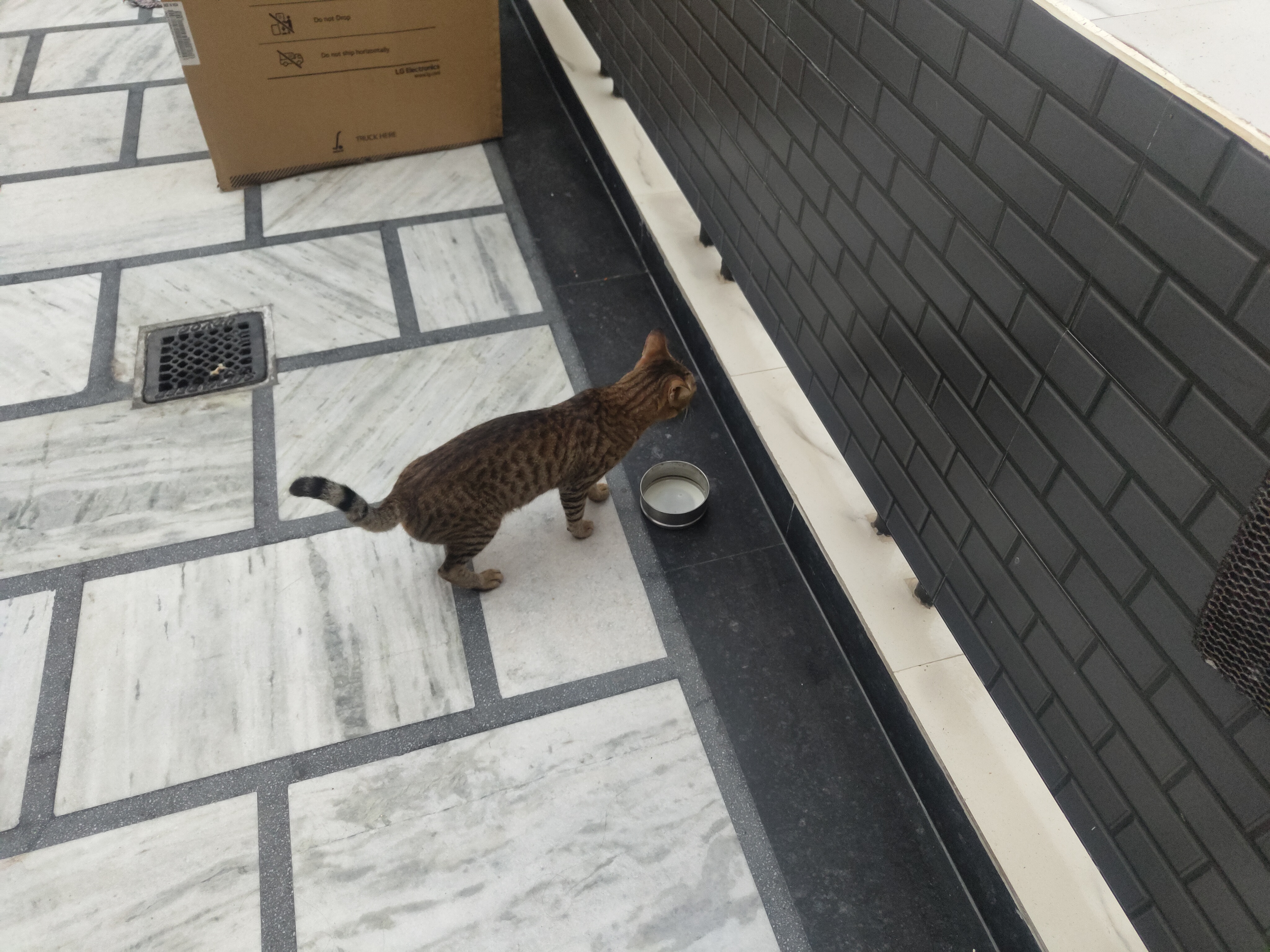 My dear friends, you all are welcome. We have a cute cat in our house but that cat comes home only when it is hungry She roams around all day long and when she needs to, she goes It was early morning today, I got out of bed at about 5:25 am and I saw a cat standing outside the door.She is meowing. I asked her what she wanted. She is not telling me anything because she knows only one language, meow meow As I go to the kitchen she follows me to the kitchen and keeps roaming back and forth there. I said there is nothing for me either so you can go from here.The milk hasn't arrived yet. It will come at 7:00 so please wait a little. But she is not leaving.I leave her and go to freshen up because I felt she wouldn't come so I left her in the middle.Its 7:00 she is sitting outside the room and waiting for me I am not looking at her because I don't like to look at her I turn my face towards her whenever she talks