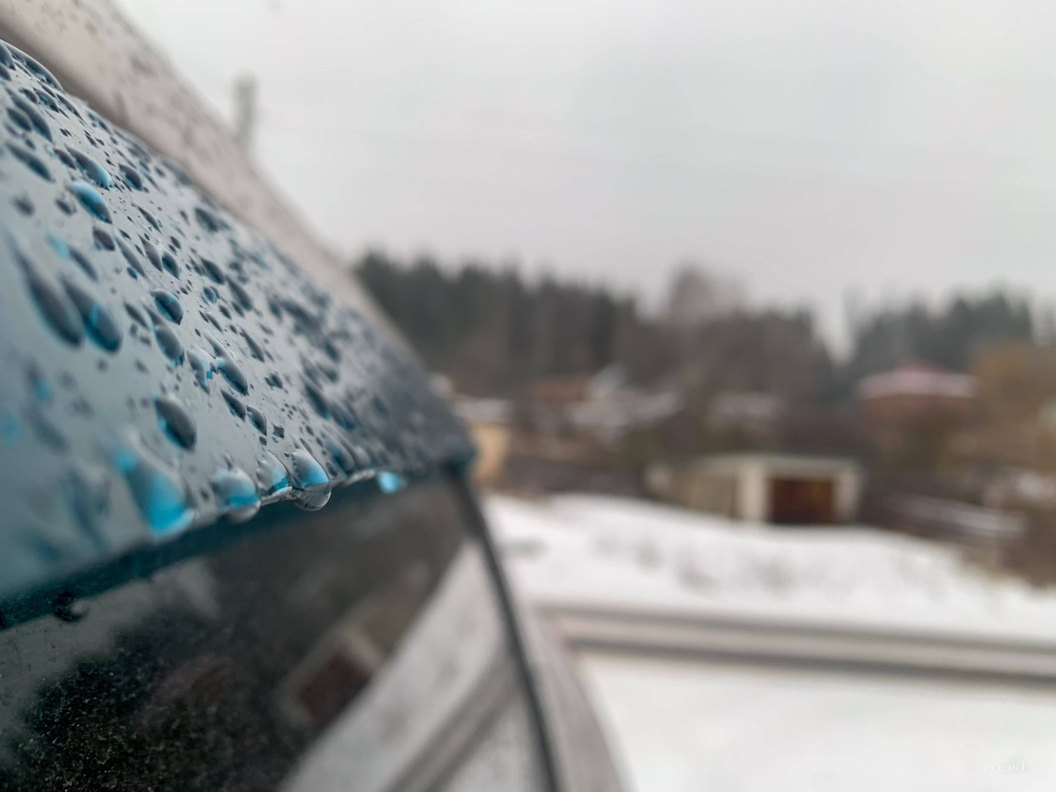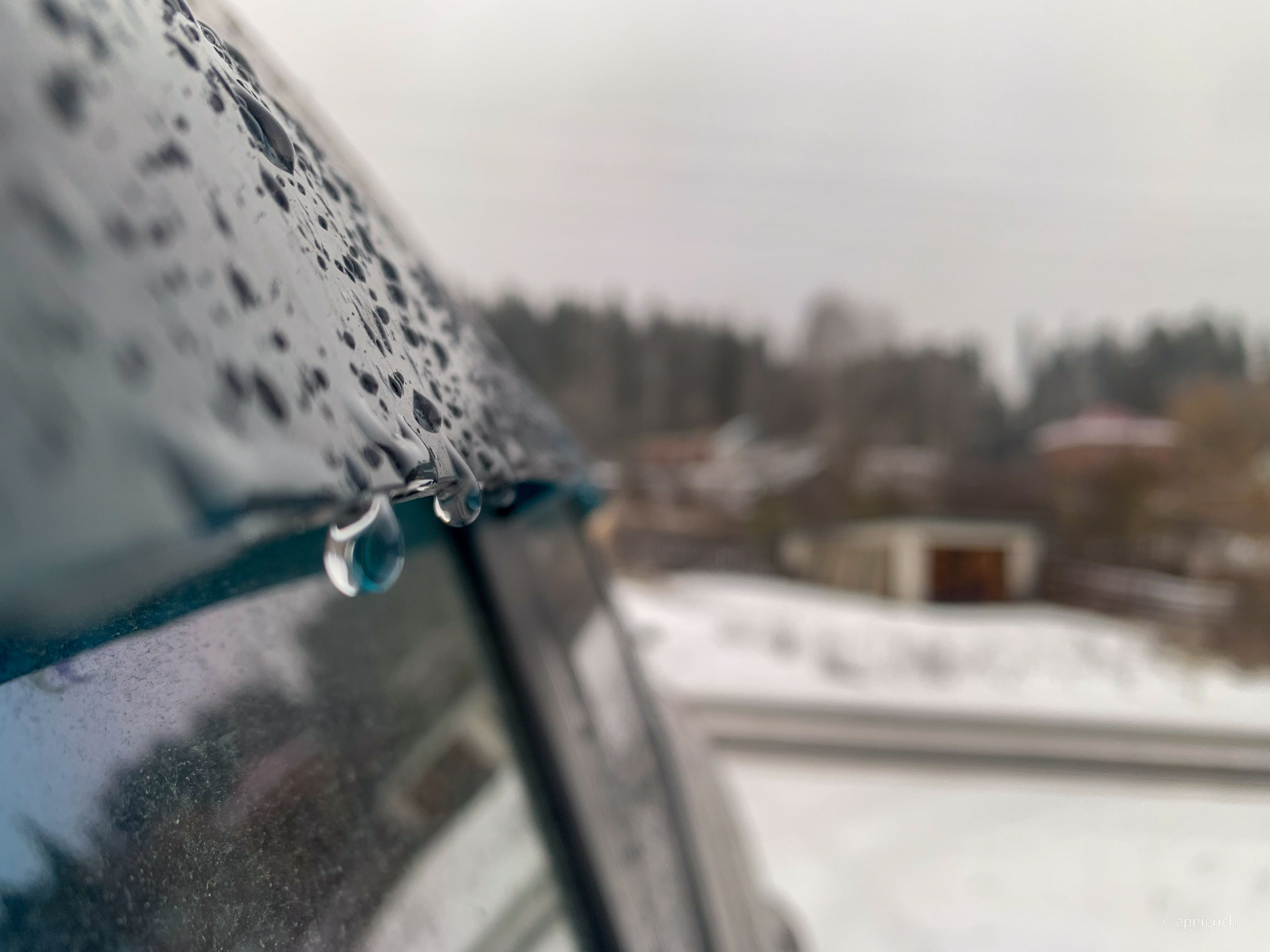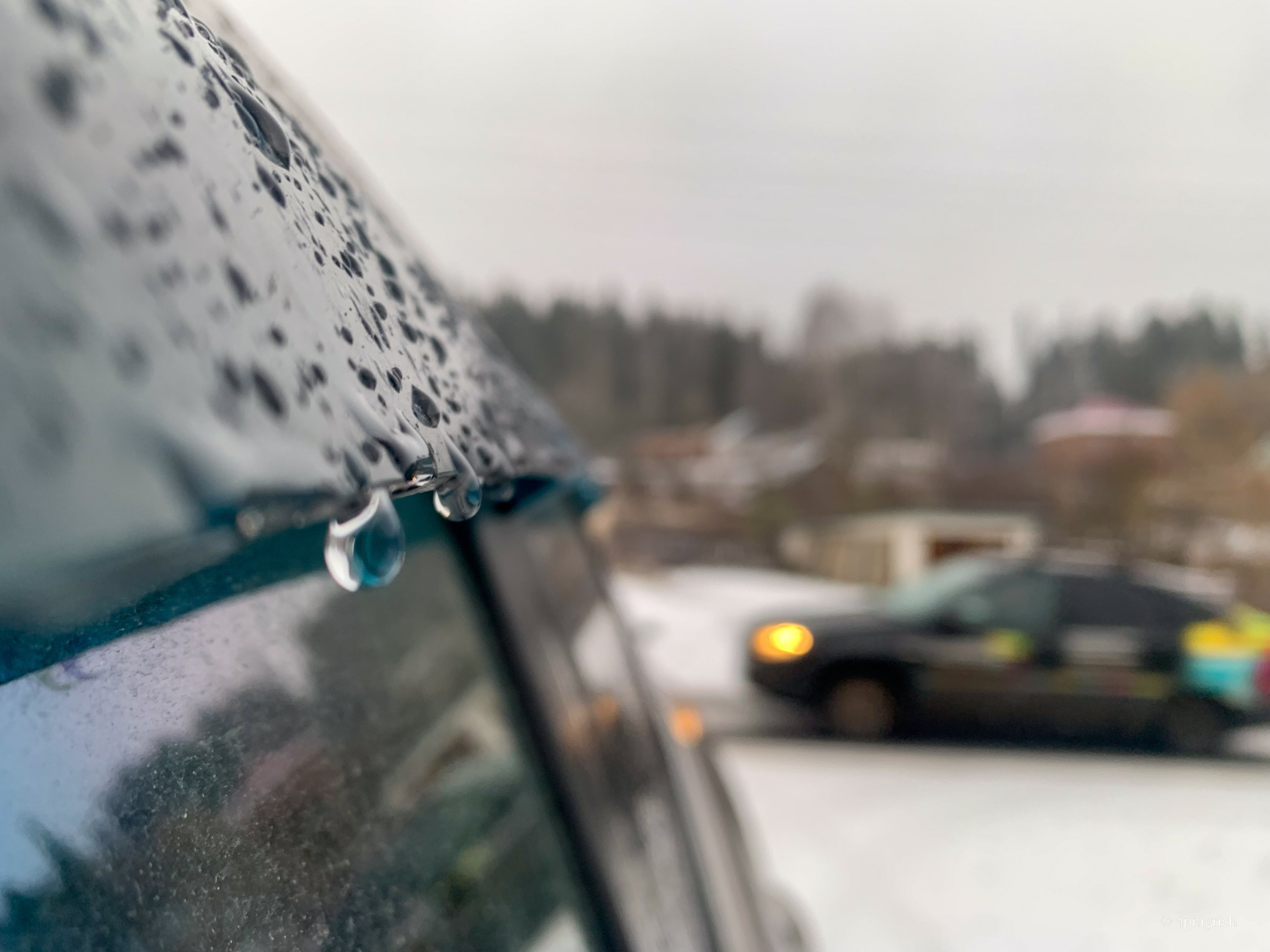 Snow falls on the car and immediately melts, drops run down the car and hang on the door windscreens.