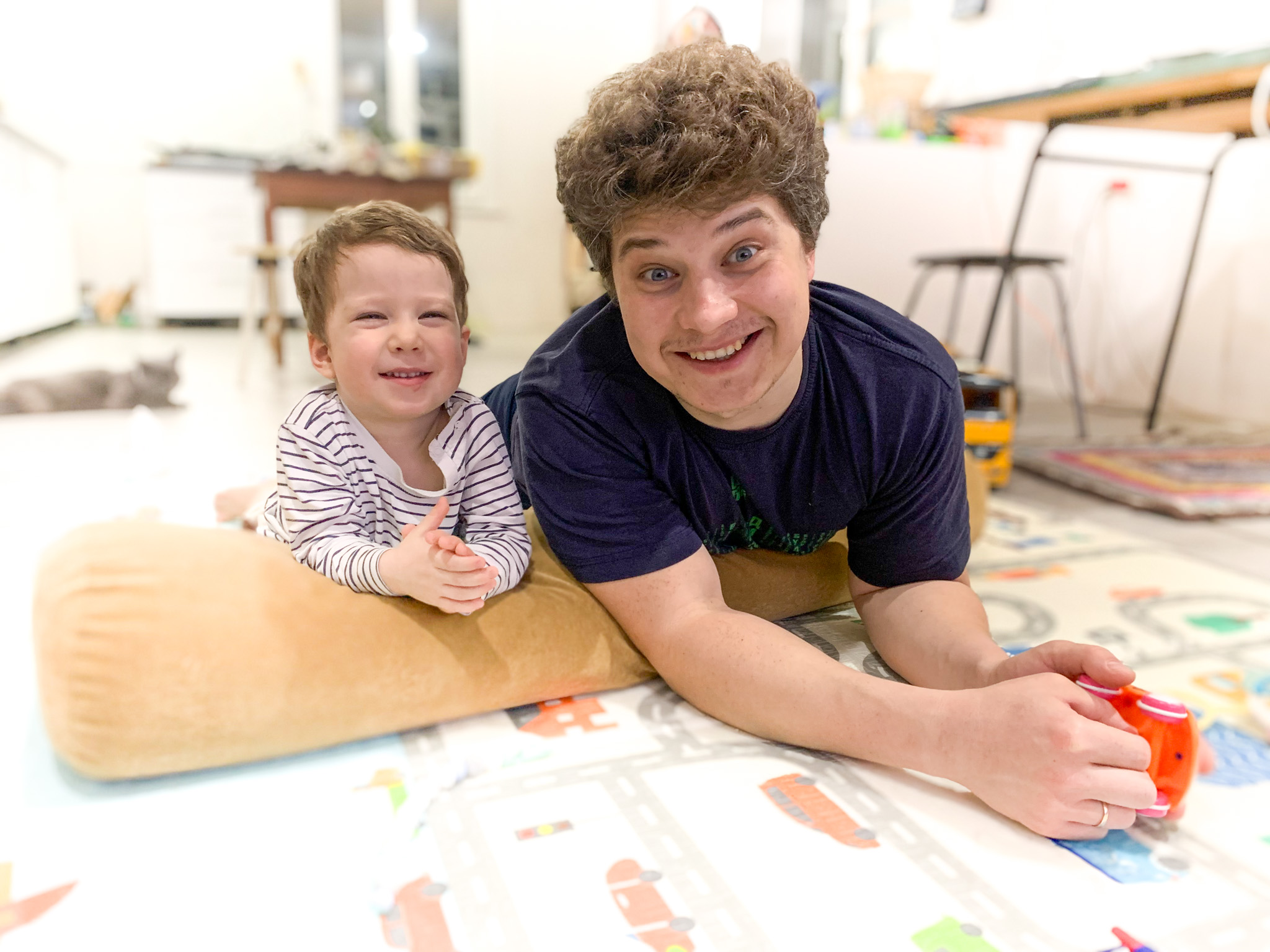 But recently, my son-in-law asked me to take a memorable photo. He taught his son to lie on the floor and watch TV. It's an art!