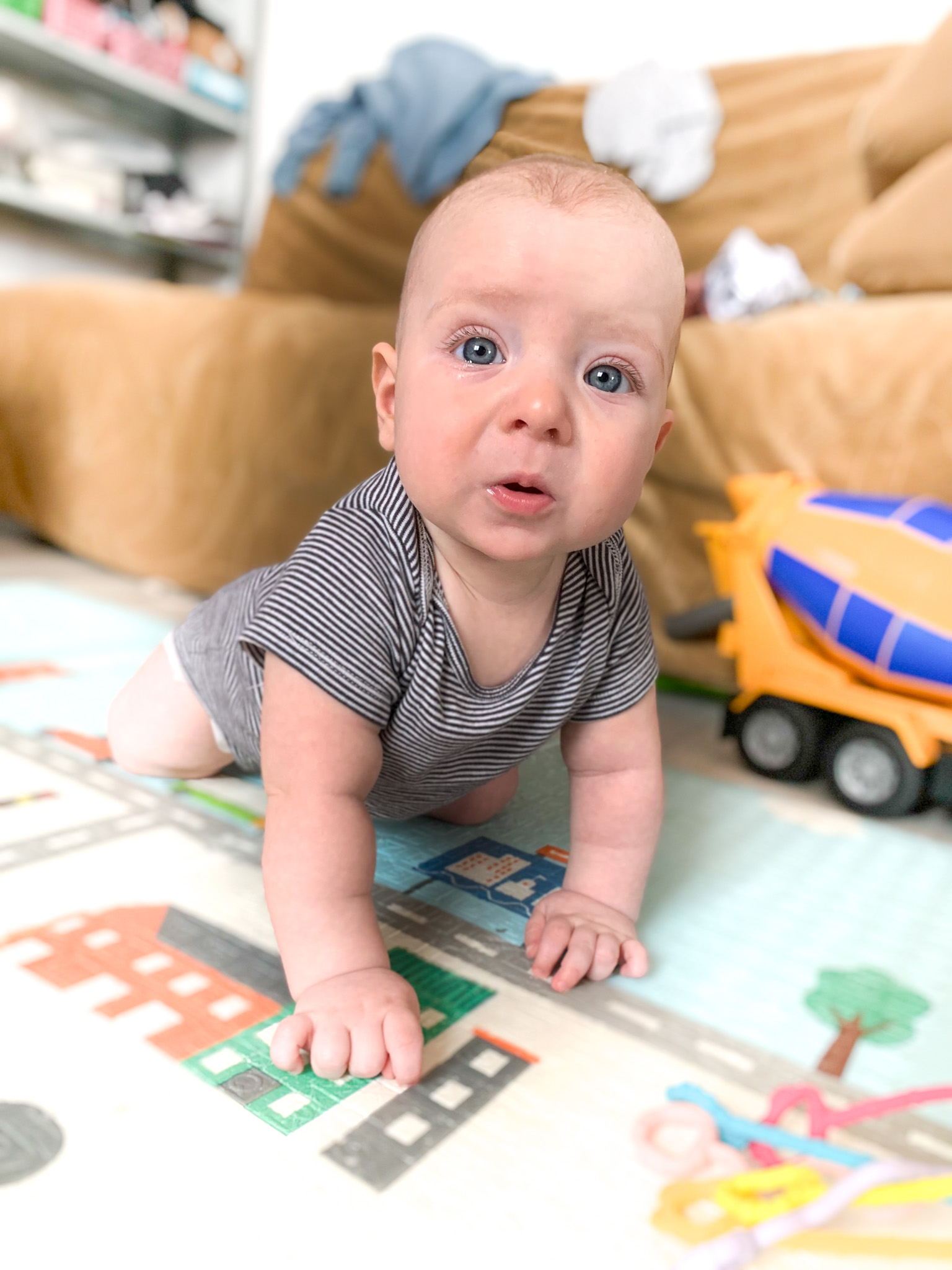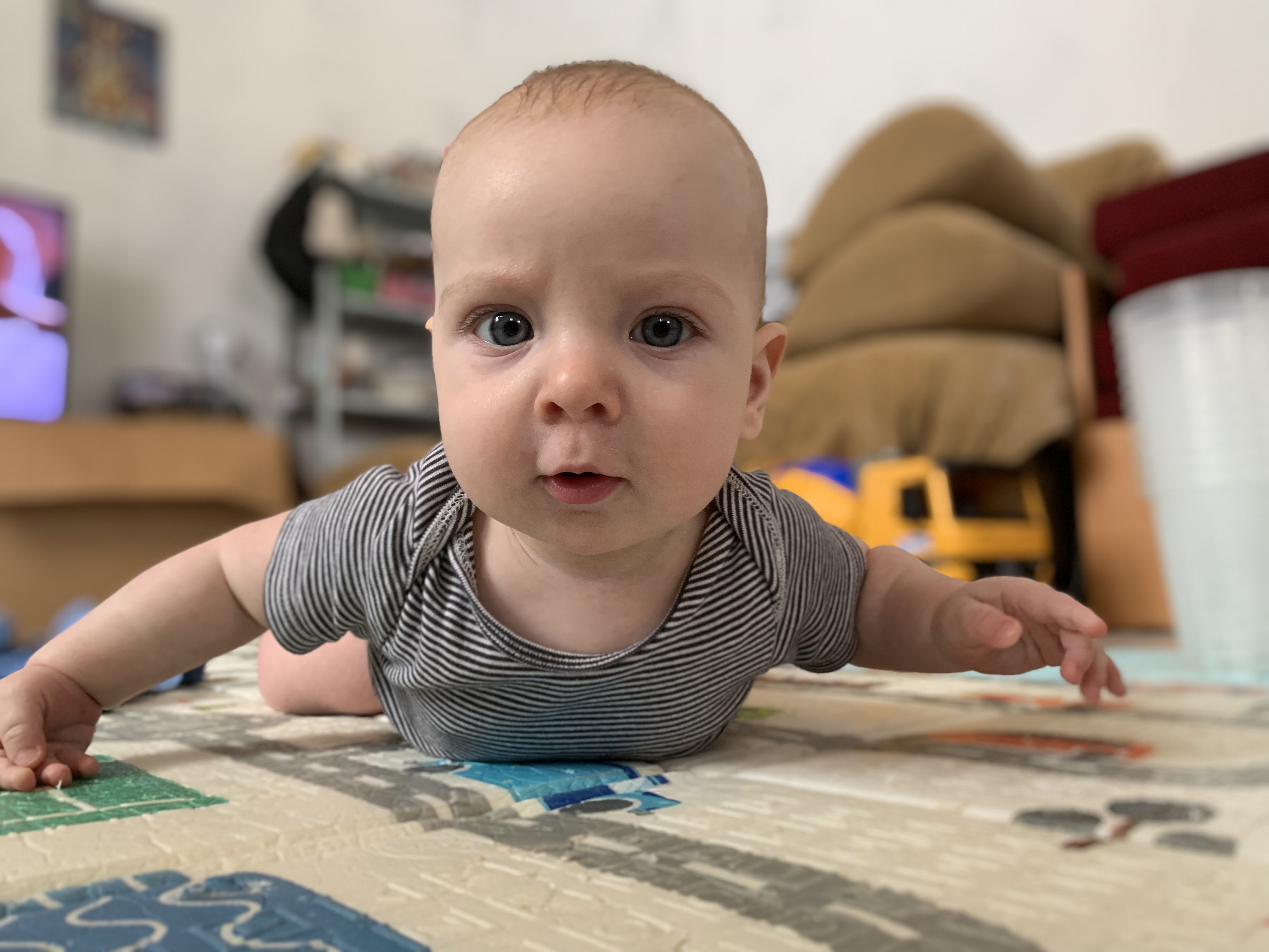 The youngest grandson. 5 months. He's just learning how to crawl on the floor and get on his knees. It takes a lot of energy, and at the end of the photo shoot, Andrey got tired and decided to show by his appearance that I needed to put away my iPhone and take my grandson in my arms.