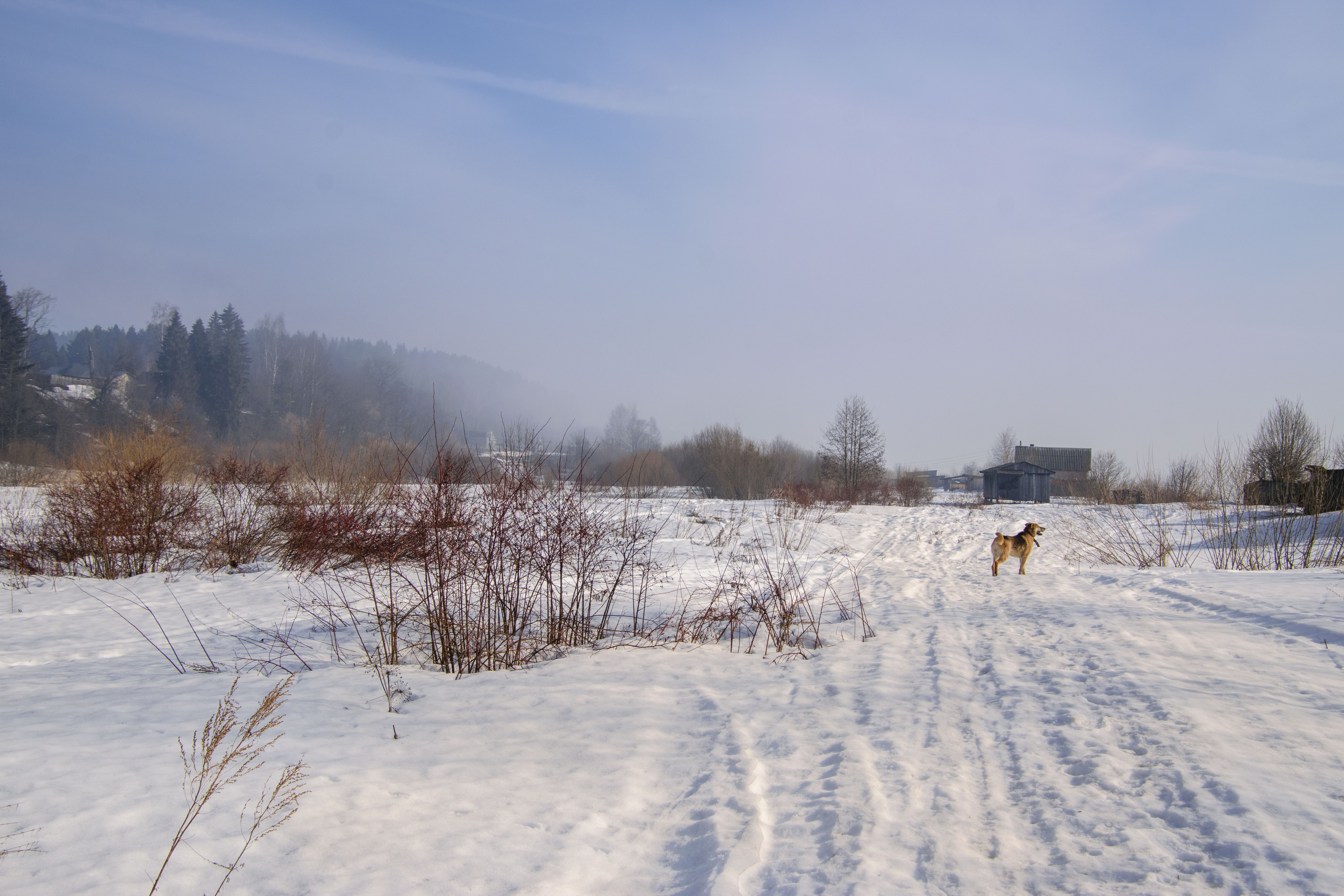 This morning told it was going to be a beautiful day. And that's exactly what happened. I didn't spend the night at home. I arrived home at 6 a.m., and there was thick fog on the way, but the sun was shining in our village, and the fog was visible only on the river. Two days ago, my wife and I agreed to go for a walk this morning to the neighboring village. We didn't change our plans; we took the dog and went for a walk. But we were too late, the fog had already left the river, but we could still see its remnants in the direction we were going.