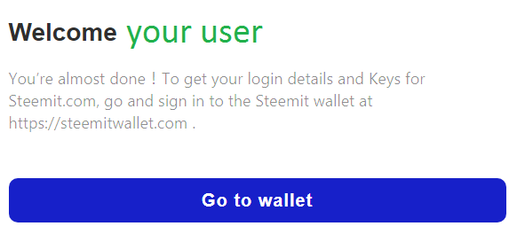 Colocas la contraseña que guardaste en la oportunidad pasada como te expliqué (no, no le tomes captura de pantalla) en el reglón que te lo solicita, aceptas los "Términos y Condiciones de Uso", también la "Política de Privacidad" (nadie lee eso pero deberían), le das a "Create account" y ya casi estamos listos. Te saldrá la siguiente pantalla donde deberás darle a "Go to wallet" e irás a la página steemitwallet.com para iniciar sesión con la clave que guardaste (y no, espero que no le hayas tomado captura de pantalla) y sacar las otras claves.