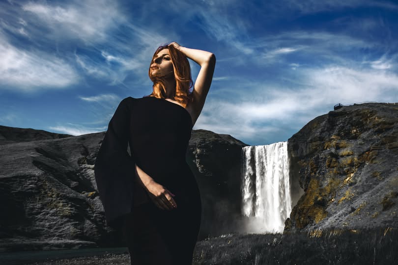 Outdoors art fashion. Skogafoss waterfall, Iceland