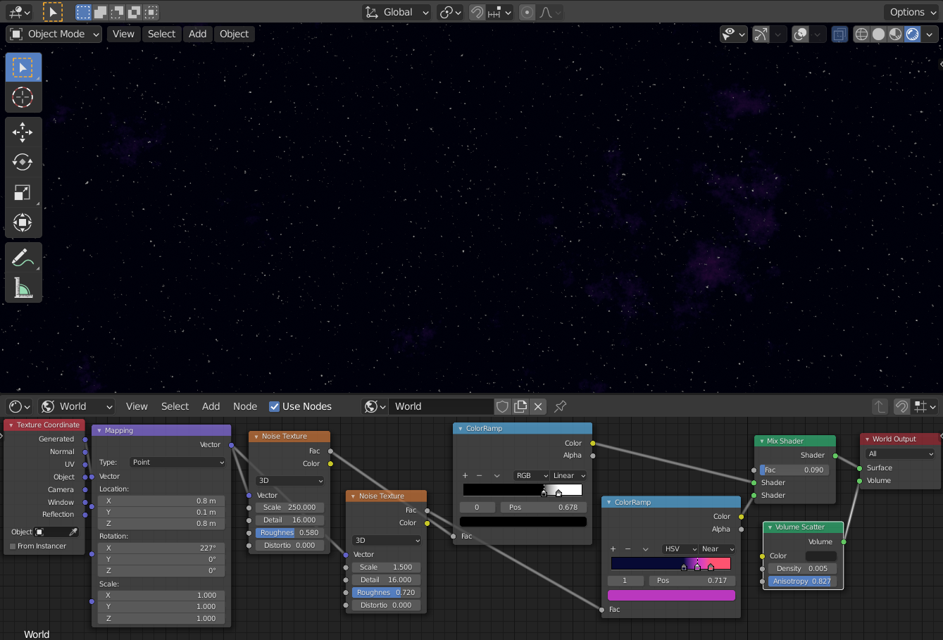 In the image we see how we generate the stars through nodes with the "noise" tool. With more of these nodes we generate the bluish "clouds" in the background.