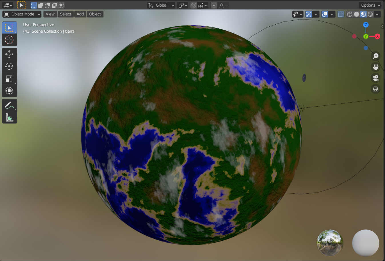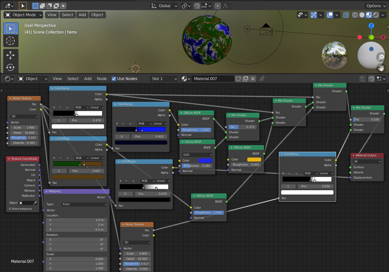 A través de los nodos comenzamos de a poco a generar efectos de textura a nuestra esfera (en esta parte demoré un poco por que posee mas detalles que las otras figuras).