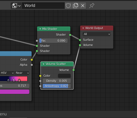 En el "world" debemos agregar un nodo "volumeScatter" a la salida (como se ve en la imagen) ya que sin este la luz no se difumina en el espacio y no la podríamos visualizar.
