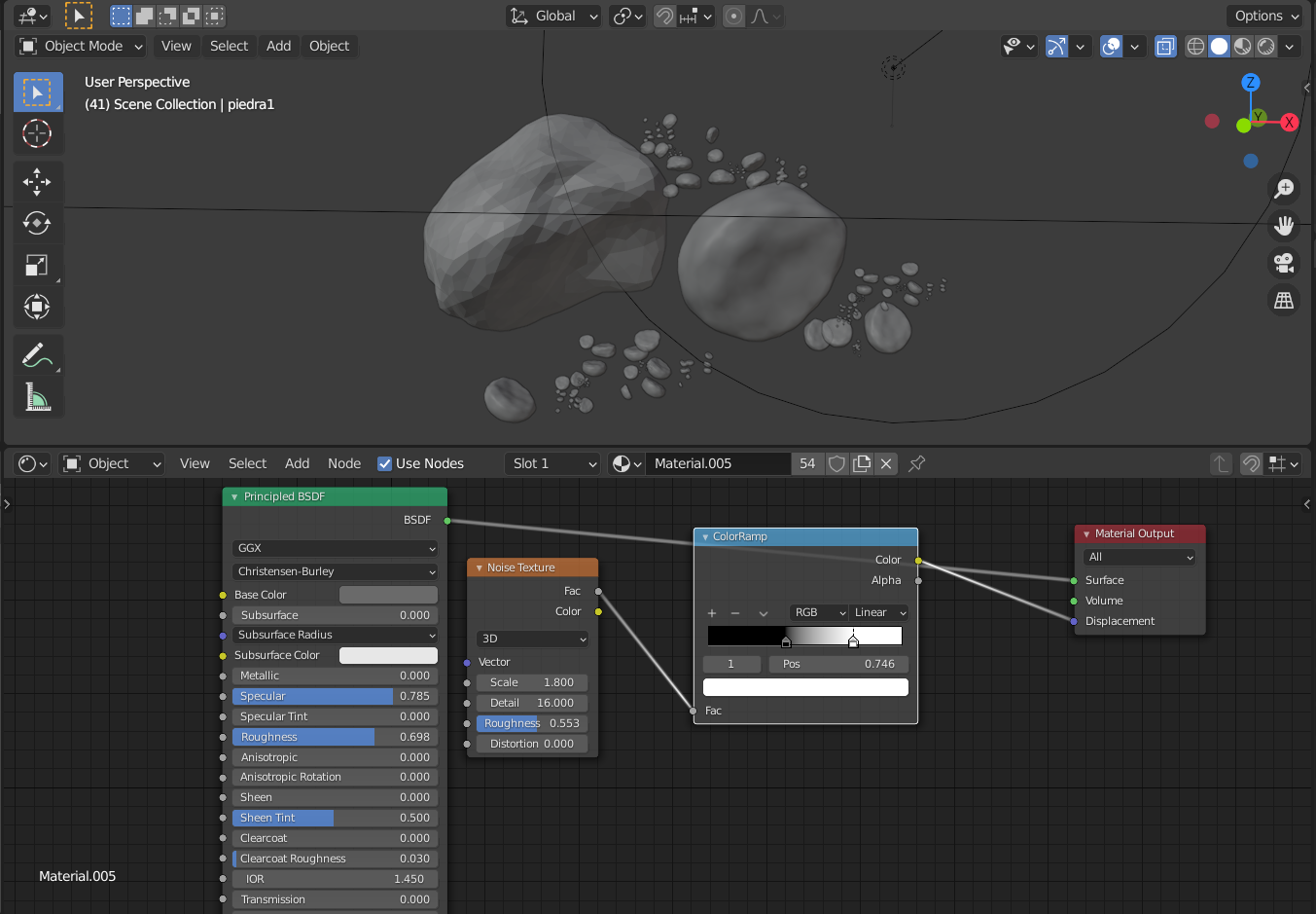 Through the nodes (as we see in the image) we change the texture and color of our asteroids until they are similar to our idea.