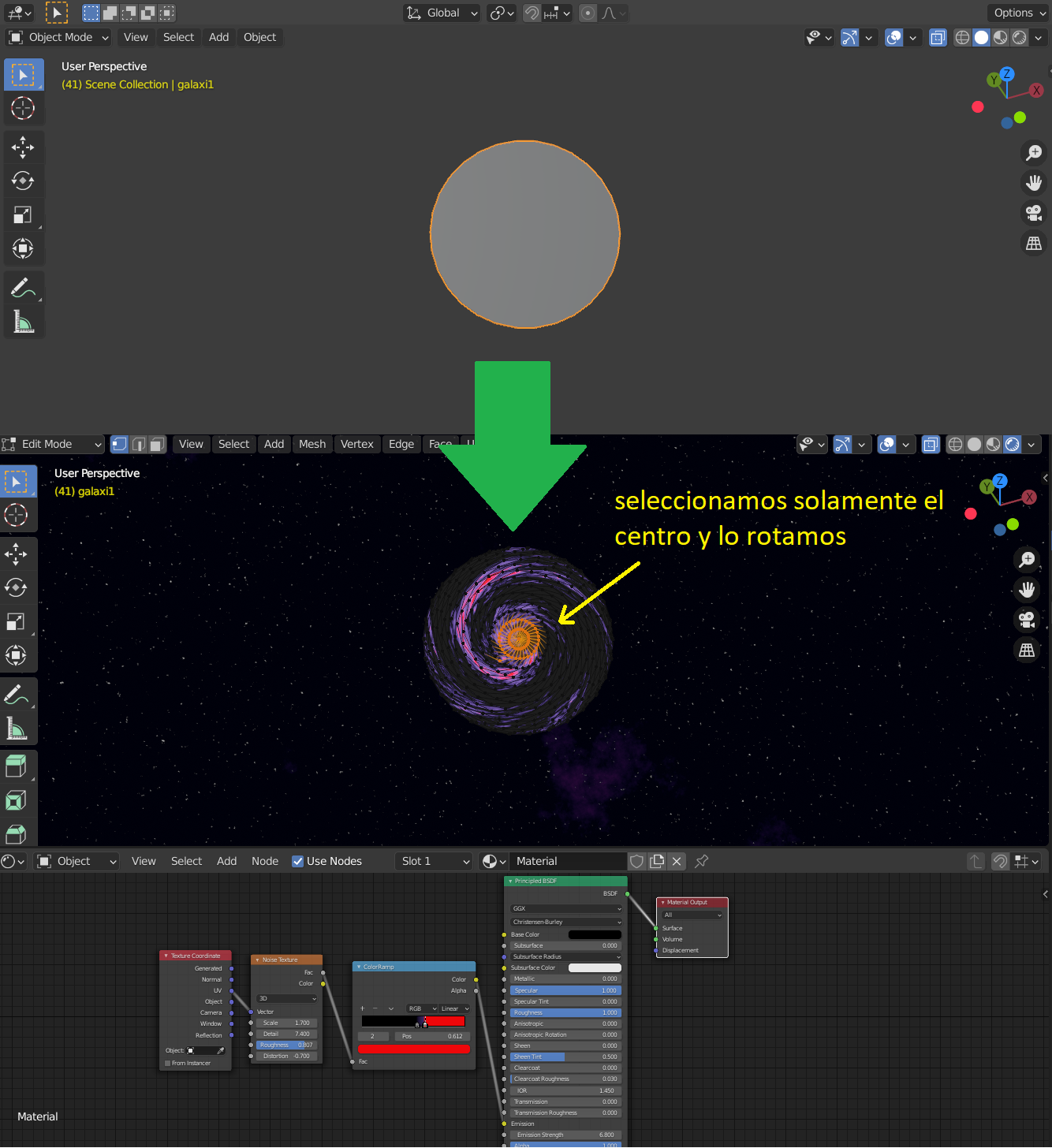 Para crear galaxias, generamos una textura para un círculo con un nodo "ruido" que coloreamos con un "ColoRamp", y luego seleccionamos solo el centro de la figura en modo edición y rotamos hasta obtener la forma que queremos.