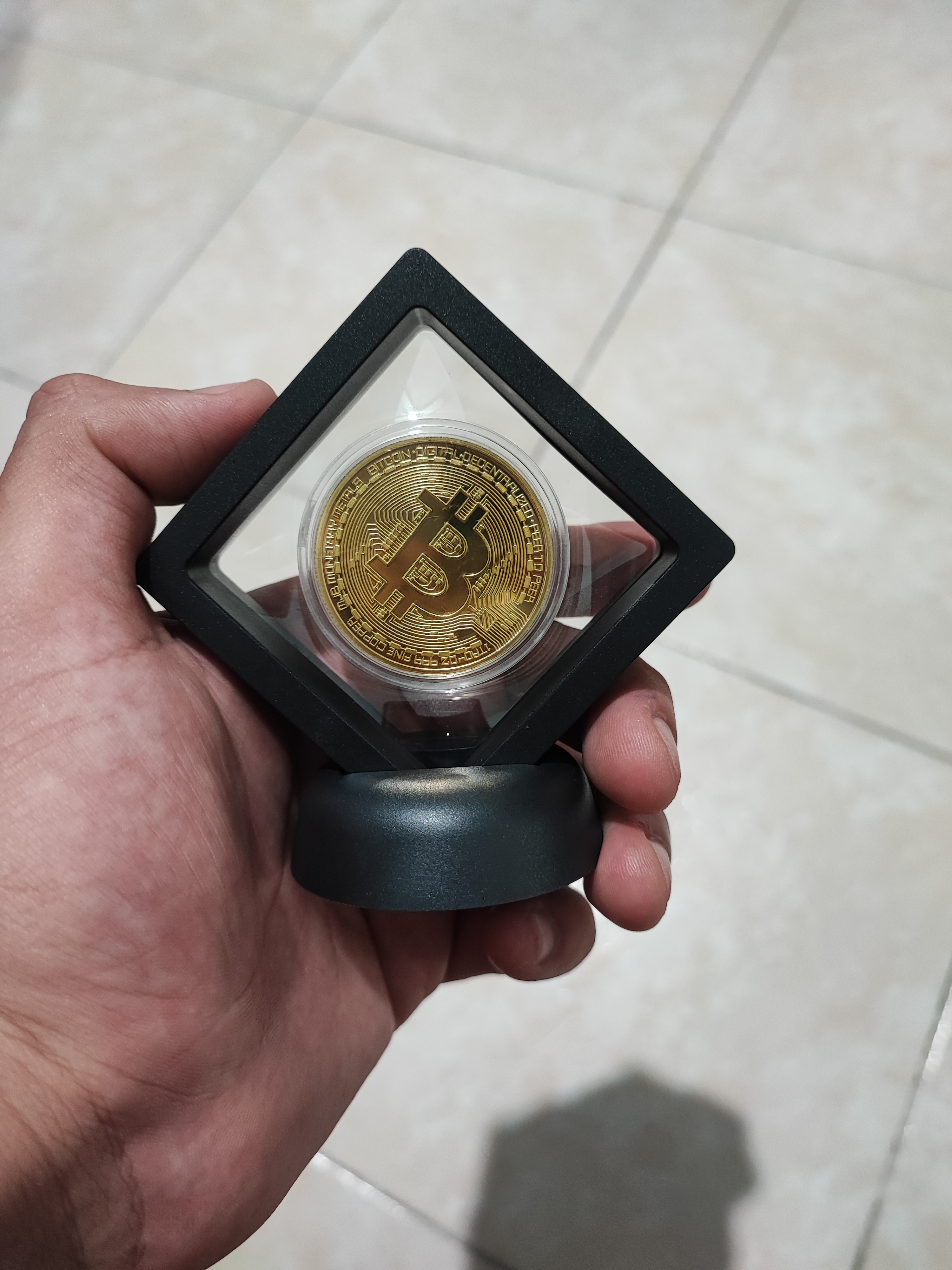 Ya hace mucho tiempo tenia la inquietud de tener alguna representación como esta de Bitcoin, simplemente porque me gusta Bitcoin y resulta ser que pedi esta por AliExpress según la descripción de la moneda es de mental y tiene chapa de oro, me costó muy barata $40 pesos mexicanos. Es una moneda de colección para los amantes de las criptomonedas, llegó en perfectas condiciones, brilla mucho y trae un estuche de plástico, aunque le compré otro exhibidor para que la moneda se vea más elegante.