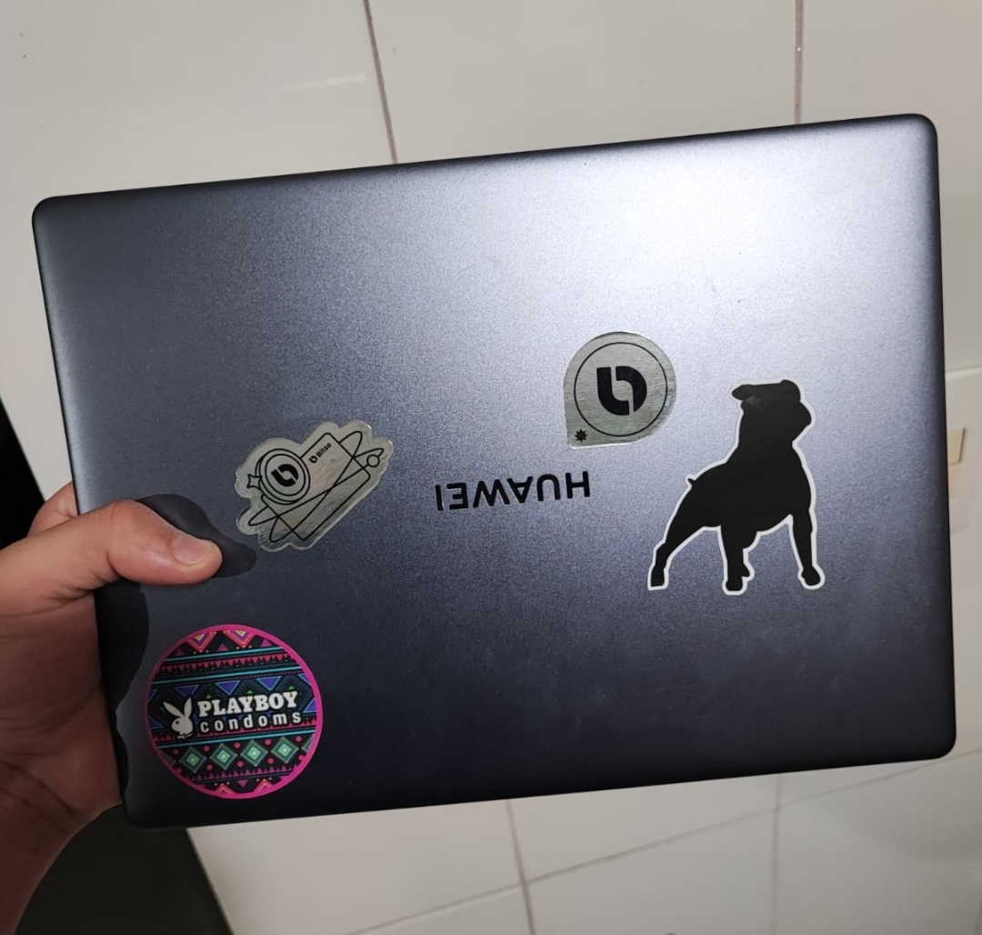 Calcomanías que tengo en mi laptop son pocas, comienzo con Bitso el intercambio de criptomonedas más grande de México, la marca de ropa mexicana Cuidado con el perro, me encanta la ropa de esta marca y una calcomanía de condones jajaja.