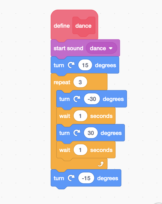 There's a scene on the alien's planet (Gelato) where the astronaut and alien dance happily to see so many gelatos. I defined another function dance here to define the dance moves. Through this function, I taught my son the use of loops. I devised a simple move of tilting between 105 degrees and 75 degrees and repeated it 3 times. The sprite was originally at 90 degrees. First, it was moved to 75 degrees by subtracting 15 degrees, and then from there, I just added and subtracted 30 degrees again and again. When it was done dancing, I switched it back to 90 degrees one last time by moving another 15 degrees.