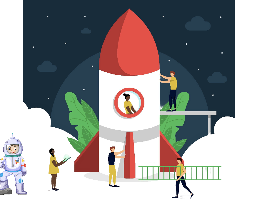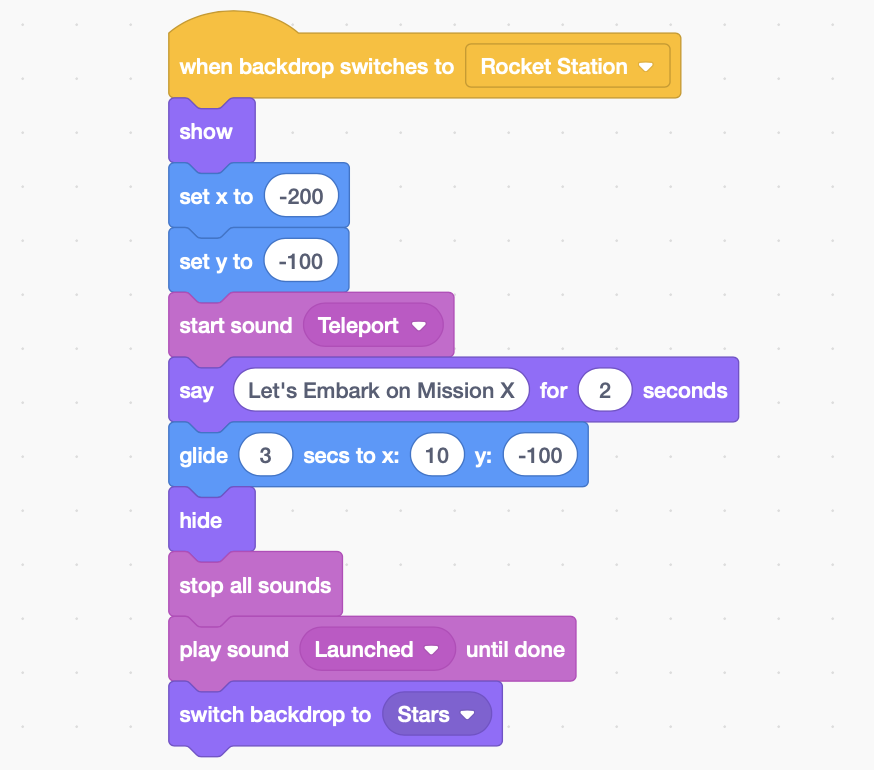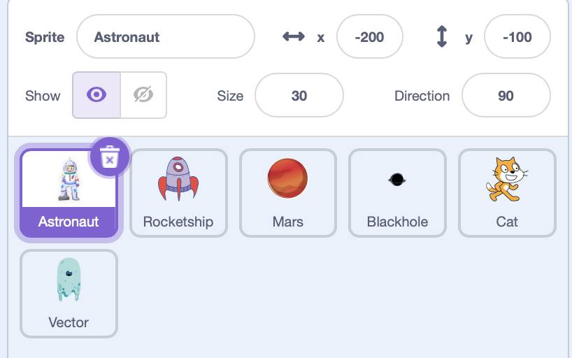 Main sprites for this story were an astronaut, a rocket, an alien (named Vector), mars, blackhole, and Scratch the cat itself which is the default character or sprite.