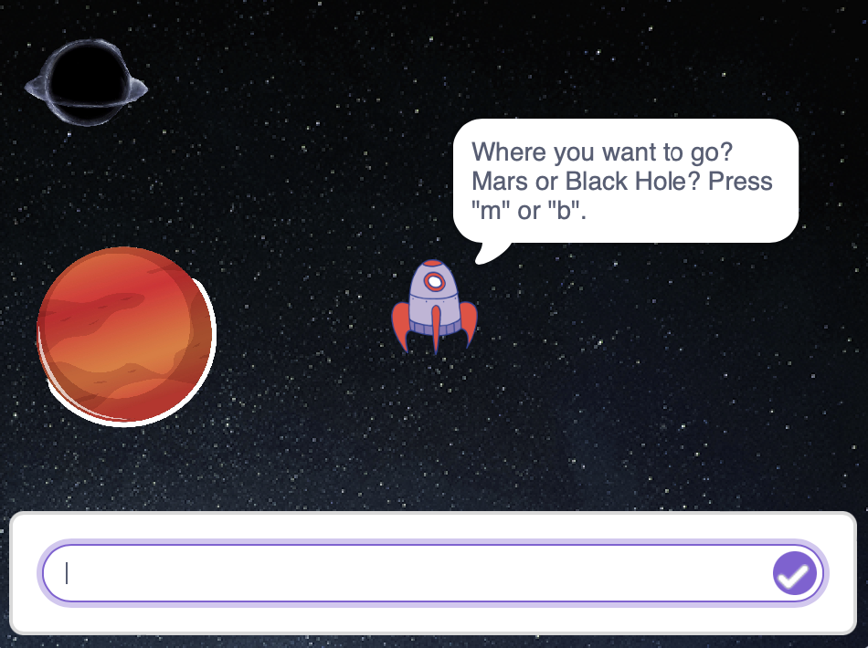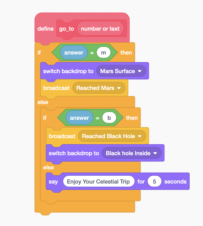 When the astronaut had to make a choice between Mars and Blackhole, I taught him about conditionals. Here, I also defined a function go_to, which took the response of the user (string) as an argument. That was just for me to check how it works in Scratch. He wouldn't understand the purpose of a function yet.