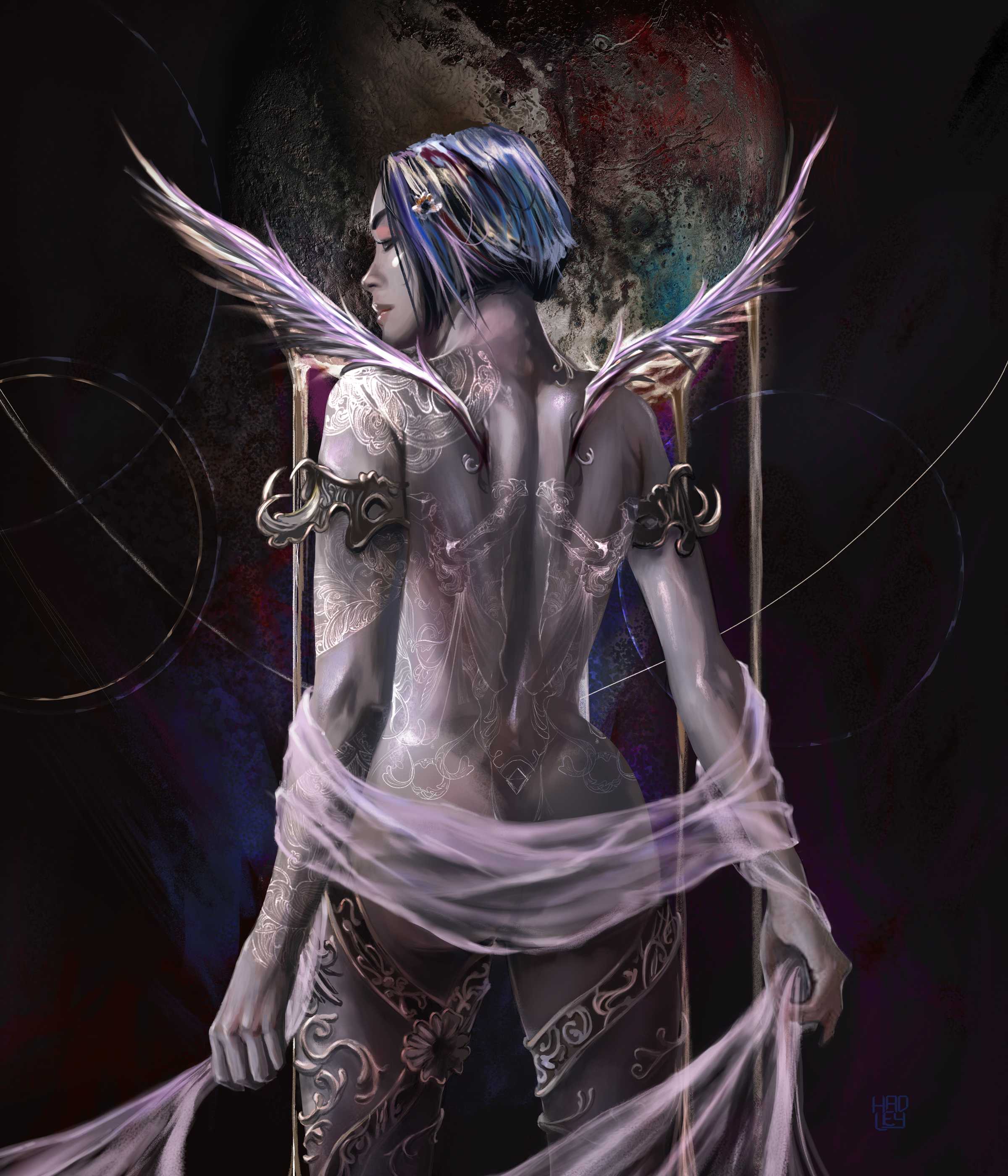 Since it is Pluto, it is necessary to add its planetary form in the background in order to achieve a relationship between the girl and the dwarf planet. Also keep adding details, such as the body metals or the new wings on her back. By the way, those prominent glows were achieved by setting the brush in the "Linear Dodge (Add)" blend mode, just the brush not the layer, that's important.