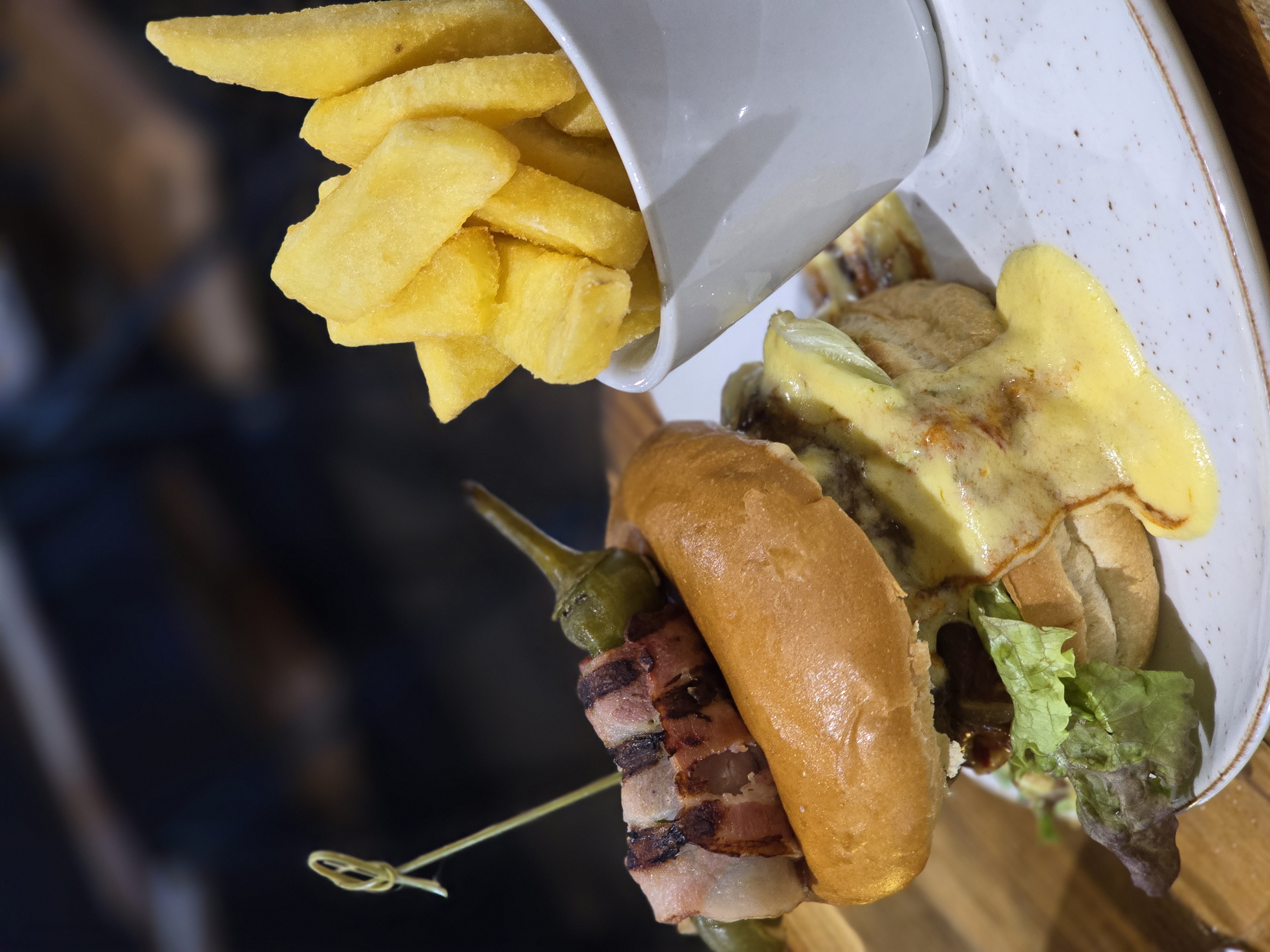 That cheesy burger and French fries look delicious. But also the place looks clean and well decorated. Absolutely worth it!