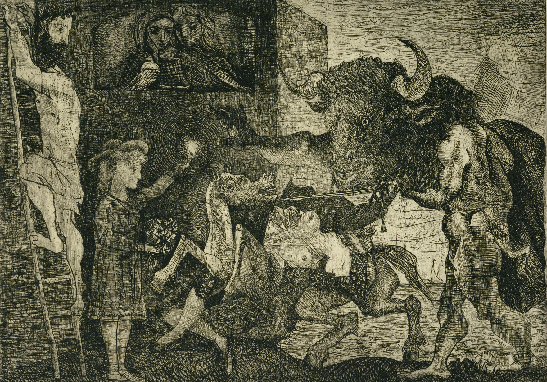 In Picasso’s print of 1935, all the figures, except one, are paying attention. A half-human/half-beast is hungry. Two women gaze at a dove. A man tries to escape up a ladder. A girl-child confronts the monster with her innocence. A beautiful matador lies asleep on a panicked horse, unaware of the menace around her.