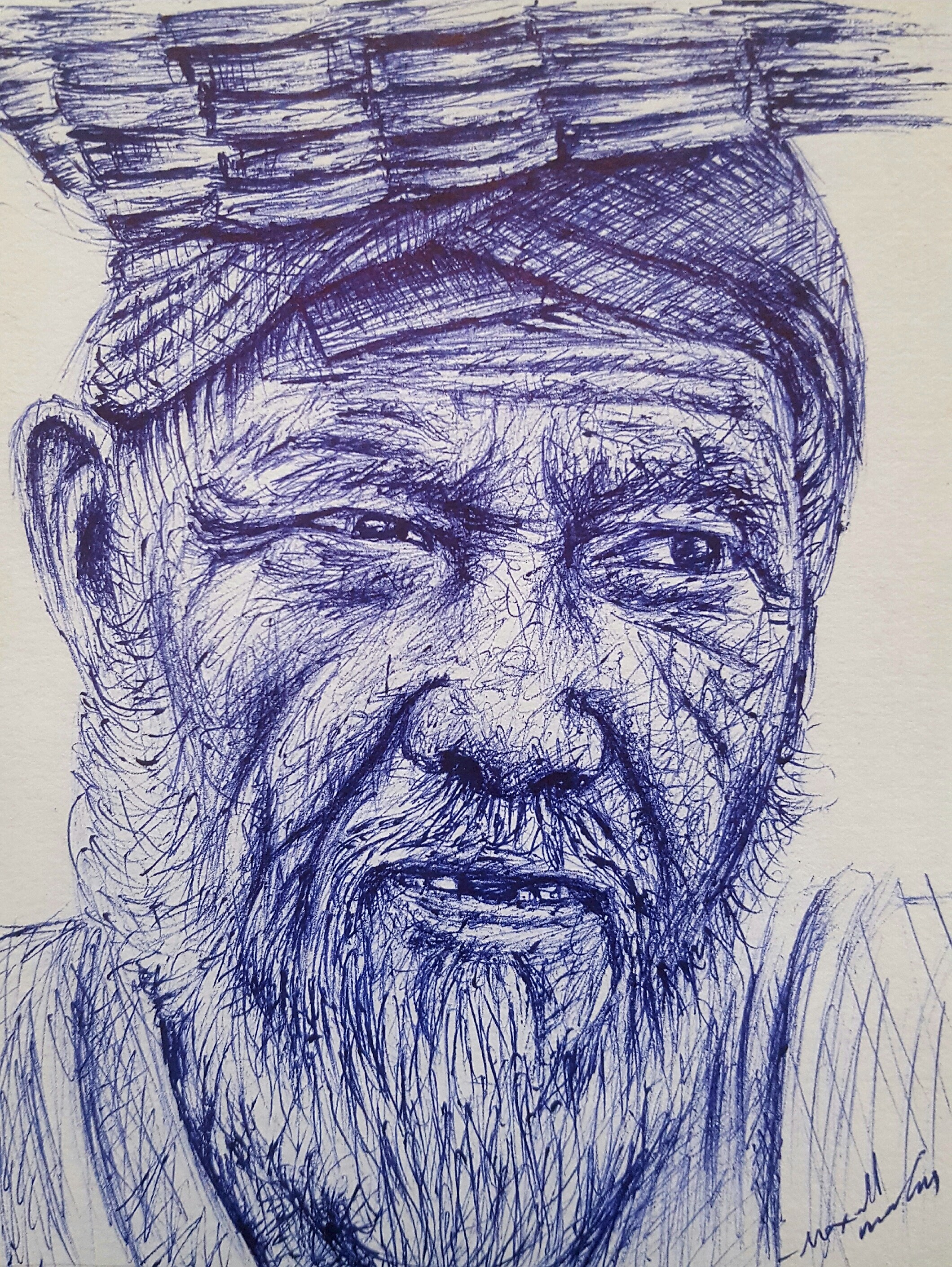 The portrait was done with a blue ballpoint pen on a cardboard paper. I used a combination of scribble and cross hatching technique to create this piece.