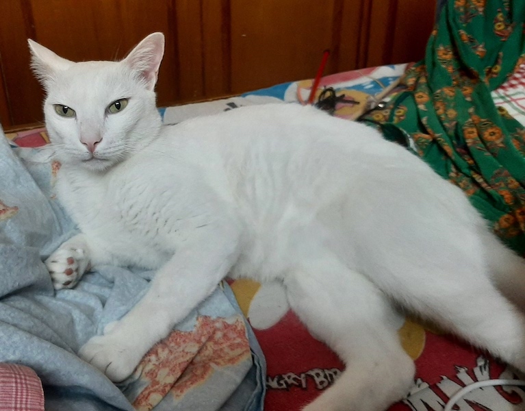 Here is one duel where cat Garu succeeds in driving Mochu out of the bed.