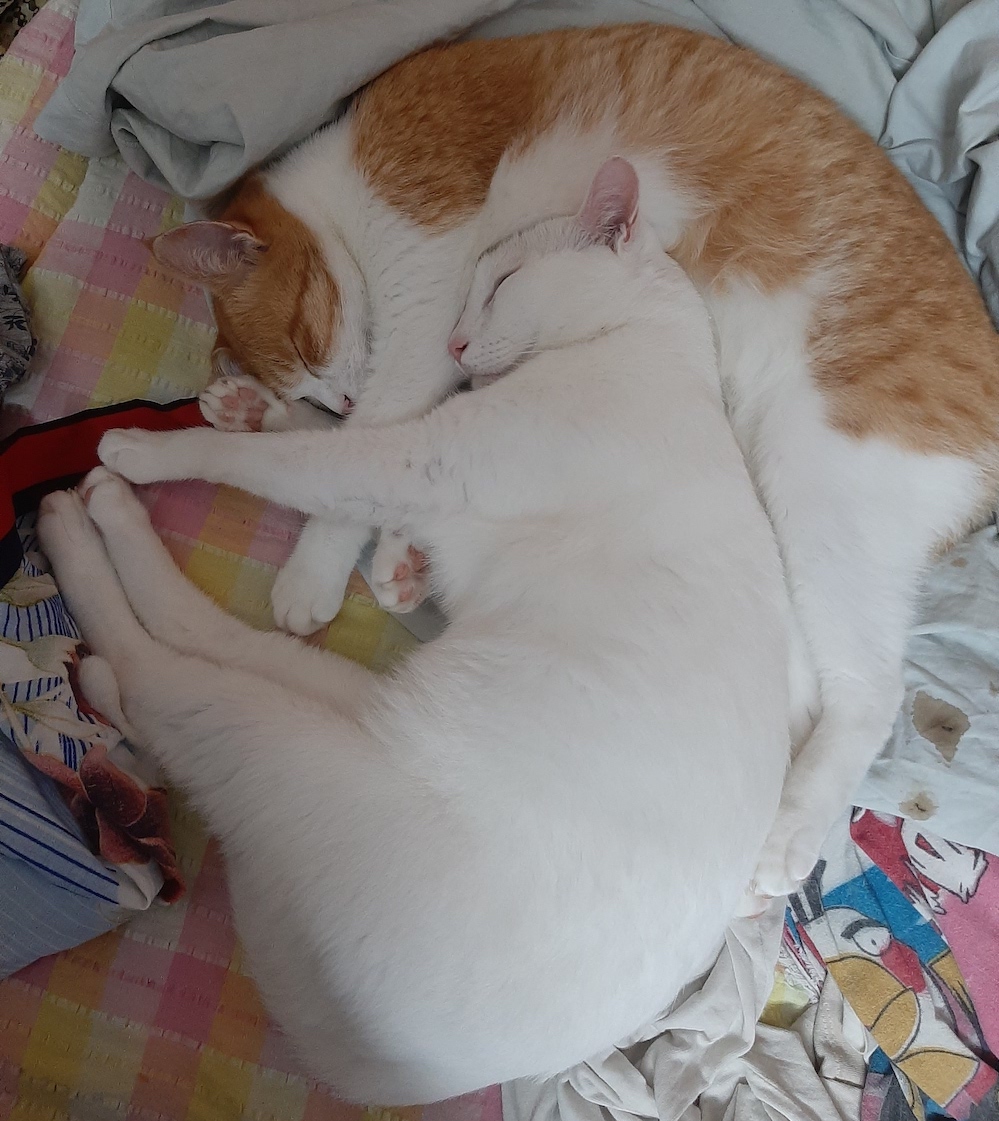 They look curled up and comfortable, pressed together as if they have a bond in sleeping merrily.