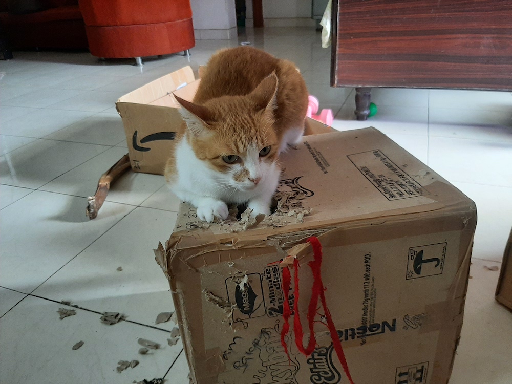 Speaking about entertainment, cat Garu exercises by scratching cardboard boxes and this cat has succeeded in making a neat hole where it can dip its paw. Neat!!