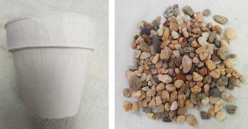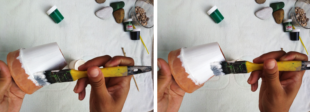 Para esta manualidad, en primer lugar limpiamos muy bien nuestras piedras medianas para evitar cualquier suciedad que pueda estar en la superficie, una vez limpio procedemos a pintar con nuestra brocha la maceta de arcilla con color blanco, en este paso es necesario dar al menos 3 capas de color para evitar cualquier claroscuro que se pueda ver, así mismo lo hacemos por la parte inferior para darle un mejor acabado. Dejar secar al menos 10 min para que seque nuestra maceta.