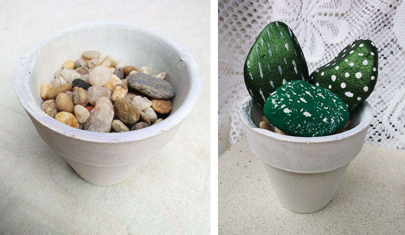 We then order what will be needed to assemble the cactus pot, including: decorative stones, white packaging, and our medium cactus-shaped stones. We add the decorative stones inside the container and place our cactus harmoniously inside the pot, thus simulating a plant. This craft is super fun and full of good vibes, it is ideal for all types of environments.